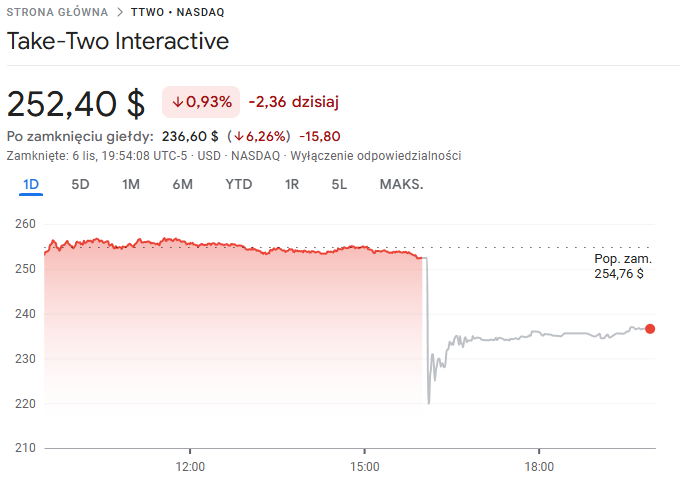 Gwałtowny zjazd widoczny na wykresie to dokładny moment, w którym ogłoszono opóźnienie GTA 6. Linia jest szara, ponieważ zrobiono to 5 minut po zamknięciu amerykańskiej giełdy, a więc dane dotyczą rynku „po godzinach”.