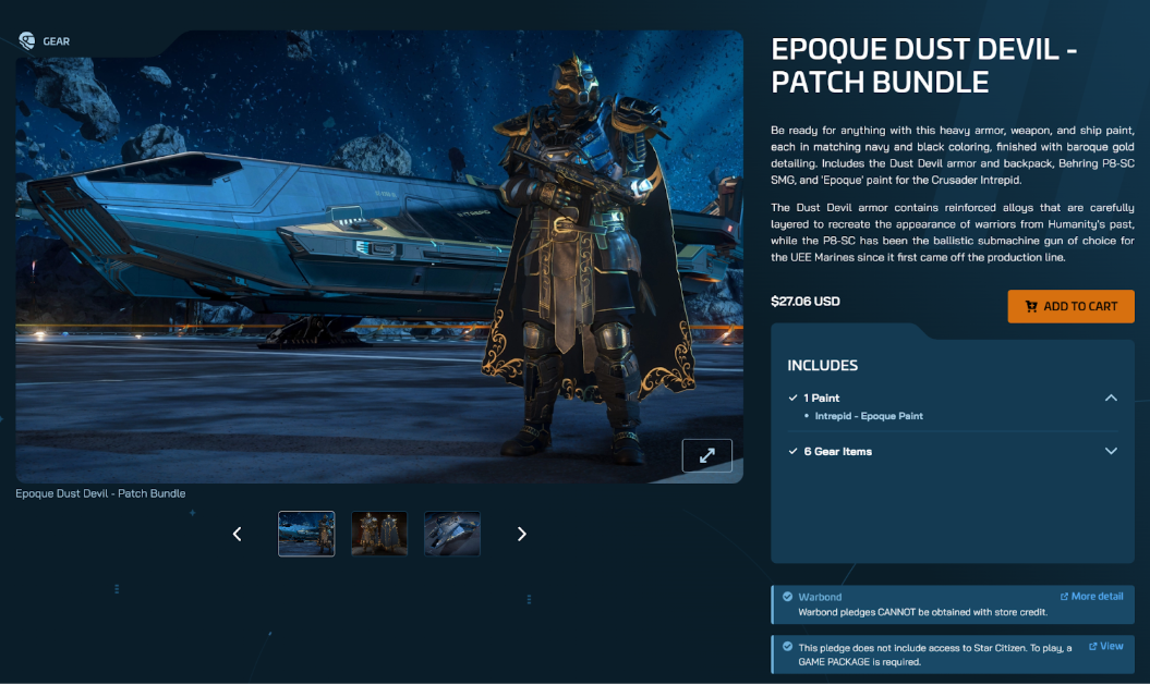 Mianowicie tzw. patch bundles, czyli dostępne tylko przez jakiś czas „paczki” możliwe do kupienia wyłącznie za gotówkę, zawierające unikalny pancerz, broń i farbę na statek. Problem polega na tym, że najczęściej graczowi X podoba się jedynie część zestawu, np. zbroja czy skórka… Ale nie może wybrać. Musi kupić wszystko albo nic. Patch bundles zaczęły się pojawiać potem przy każdym patchu i istnieją do dzisiaj. Jest to przykład drapieżnej i – niestety – skutecznej polityki marketingowej CIG, bo mimo wskazanego powyżej mankamentu owe paczki schodzą jak świeże bułeczki.