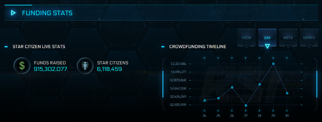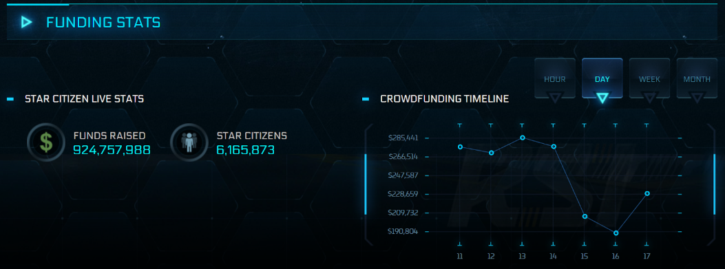 Pod koniec odbywającego się na przełomie listopada i grudnia Intergalactic Aerospace Expo oficjalna podstrona robertsspaceindustries.com informująca o finansowaniu produkcji doniosła, że datki graczy przekroczyły 900 mln dolarów.