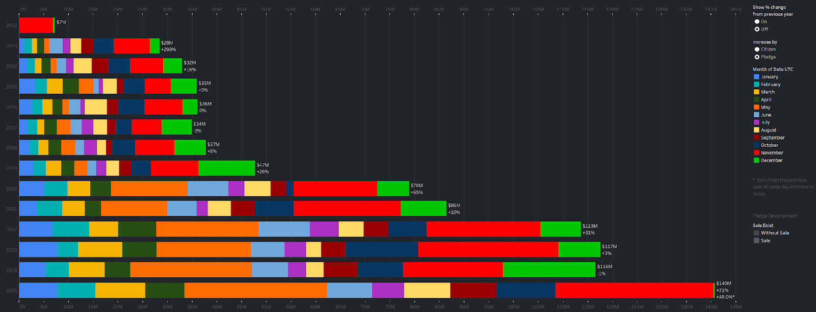 Gdy pisałem dla CD-Action ostatni artykuł o Star Citizenie, czyli w październiku zeszłego roku, budżet gry wynosił 723 mln (jeszcze przed Intergalactic Aerospace Expo, które to wydarzenie jest głównym źródłem przychodu Cloud Imperium Games). Przybyły od tego czasu 192 mln, zatem gracze wciąż ufają tej produkcji, a lawina mamony narasta. Wykresy wyraźnie wskazują, że rok 2025 ustanowi kolejny rekord, znacznie przekraczający liczby z lat poprzednich.