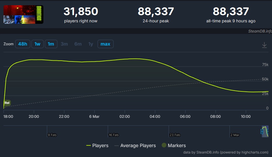 Nic takiego się jednak nie stało – możemy to powiedzieć z całą pewnością, bo choćby serwery Marathonu miały się nagle całkowicie zawalić, to gra zaliczyła od razu dużo lepszy start od memicznej już gry Firewalk Studios. Po pierwsze, jeśli zerkniemy na SteamDB, to zobaczymy, że produkcja wywołała spore zainteresowanie. W szczytowym momencie w Marathon grało ponad 88 tysięcy graczy.