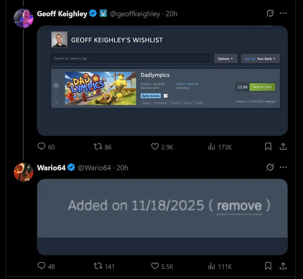 Pożaru nie zgasił sam Keighley, który w odpowiedzi na pytanie o swoją listę życzeń odpowiedział, przedstawiając jej zrzut ekranu. Grą, która wywołała takie zamieszanie, ma być Dadlympics – wieloosobowa produkcja z września 2024 roku, która w szczycie popularności zgromadziła 6 graczy bawiących się jednocześnie. Jak łatwo dostrzec, Keighley dodał tytuł do swojej listy dopiero 18 listopada – czyli dokładnie wtedy, kiedy jego steamowa lista życzeń zwróciła uwagę graczy.
