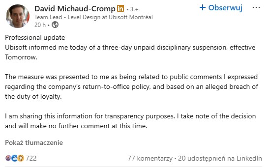 27 stycznia developer ogłosił na LinkedInie, że Ubisoft poinformował go o trzydniowym zawieszeniu dyscyplinarnym bez wynagrodzenia. Kara ta została nałożona w związku z publicznymi opiniami, które wyraził na temat powrotu do biura. Miało być to rzekomo naruszenie obowiązku lojalności. Michaud-Cromp stwierdził, że wstrzyma się od komentarzy na temat tej decyzji.