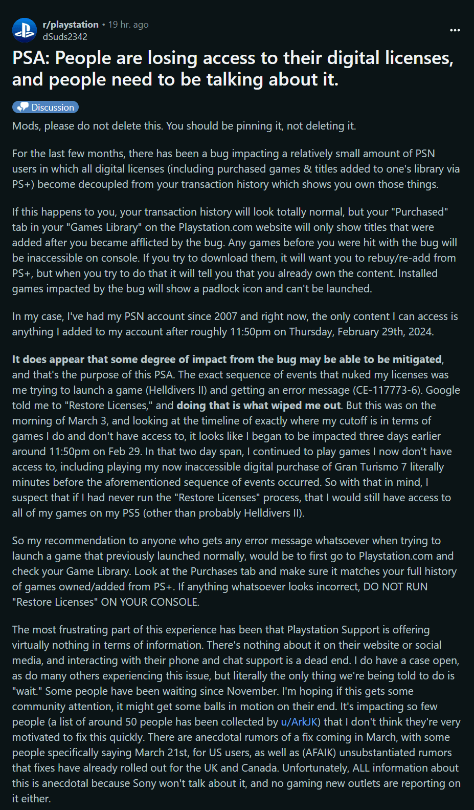 Wedle zawartych w nim informacji pierwsze doniesienia o problemach z rozpoznawaniem licencji pochodzą jeszcze sprzed kilku miesięcy. W jaki dokładnie sposób objawia się rzeczony błąd? Wszelkie dokonane przez nas za pośrednictwem PlayStation Store transakcje będą prezentowały się poprawnie, jednakże zakładka z posiadanymi grami dostępna za pośrednictwem biblioteki będzie wyświetlała jedynie produkty, które zostały przypisane do konta już po wystąpieniu problemu. Co więcej, znajdujące się obecnie na dysku konsoli tytuły będą niemożliwe do uruchomienia i opatrzone ikonką kłódki. Próba włączenia takiej gry poskutkuje wyświetleniem komunikatu z prośbą o jej zakup – co, jak zostało już wspomniane, jest niemożliwe, jako że teoretycznie została ona już przypisana do konta w przeszłości.
