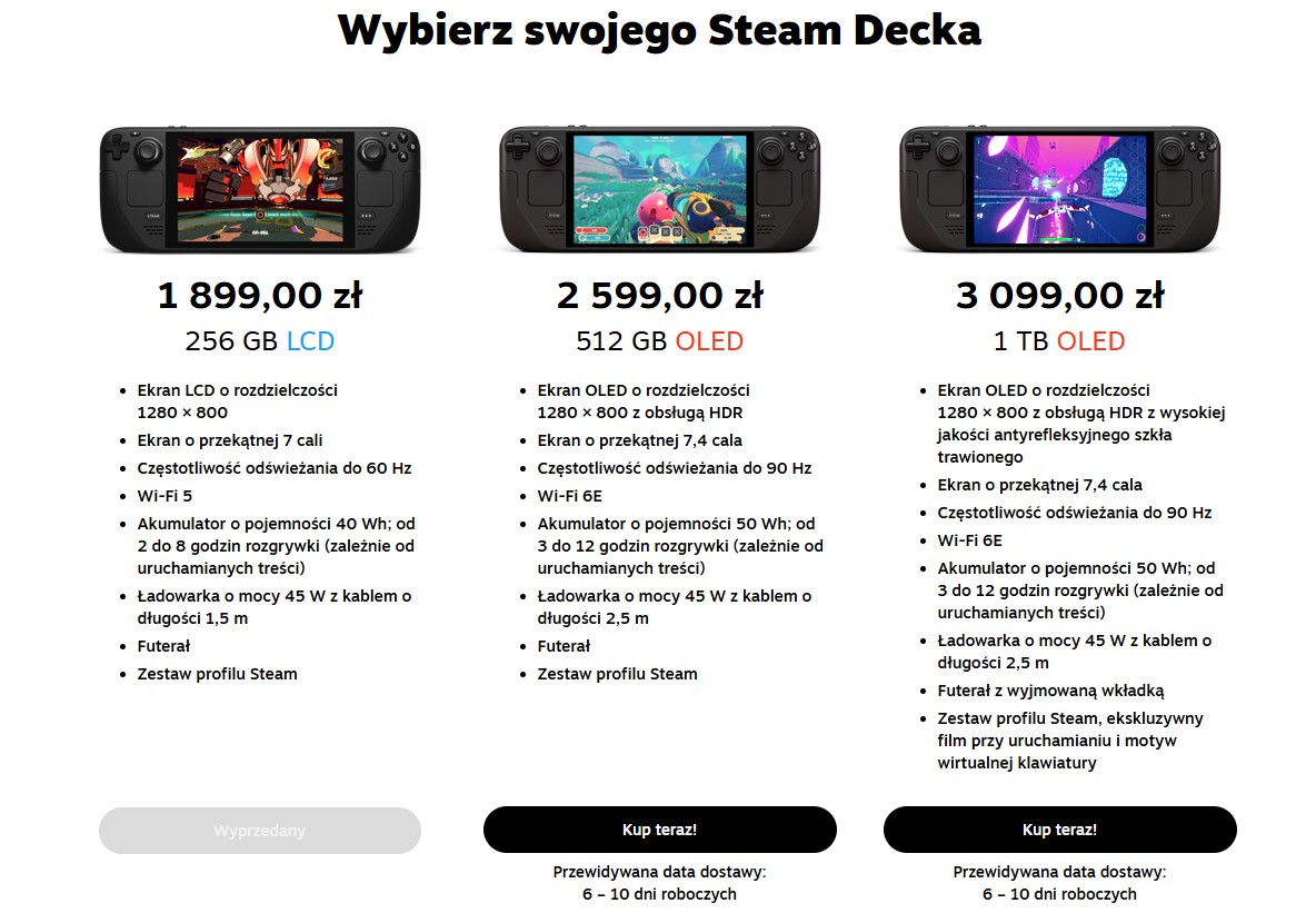 Wcześniej Valve wycofało dwa pozostałe warianty LCD: 64 GB i 512 GB. Przejście na wersję OLED było kwestią czasu. Oferuje ona nie tylko lepszą jakość obrazu (głębszą czerń, wyższy kontrast, HDR), lecz także znacznie dłuższą żywotność baterii. OLED-y są jednak droższe, co budzi obawy części graczy.