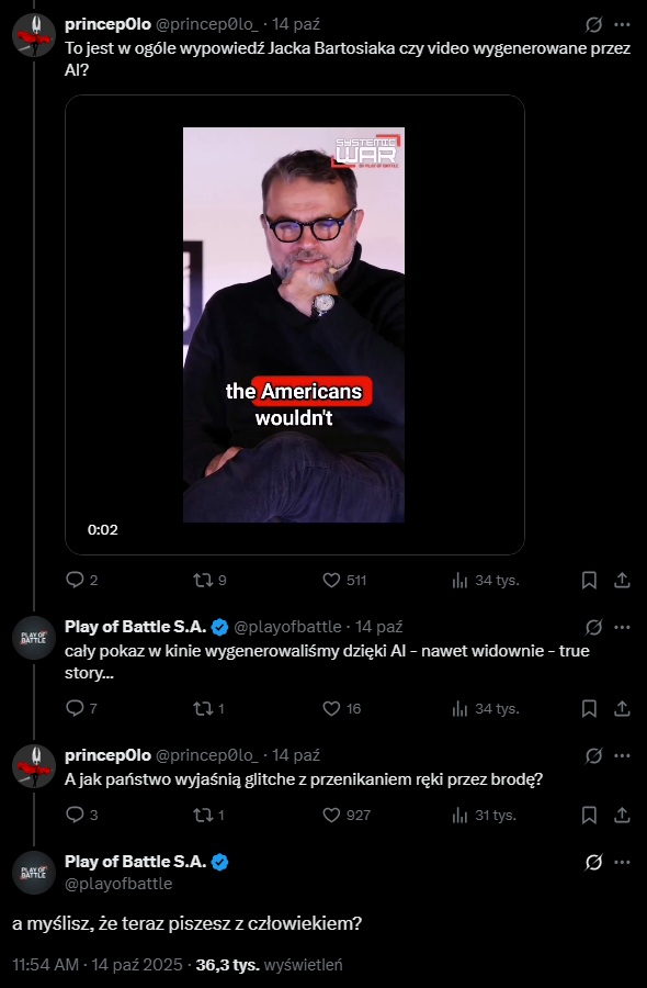 Ale, ale – to wcale nie wszystko. Twórcy Systemic War (chociaż przede wszystkim oczywiście Krzysztof Szczawiński) chwalą się, że wykorzystują AI do stworzenia gry. I tak się właśnie składa, że na platformie X zamieścili niedawno bardzo podejrzany filmik promujący grę. W pewnym momencie widać na nim, jak Jacek Bartosiak opowiadający o produkcji chce poprawić ręką okulary, ale nagle przenika ona przez jego twarz. Kiedy użytkownicy platformy zwrócili na to uwagę, developerzy gry odpowiedzieli w sposób, którego nie da się opowiedzieć, po prostu zerknijcie okiem na poniższą wymianę.