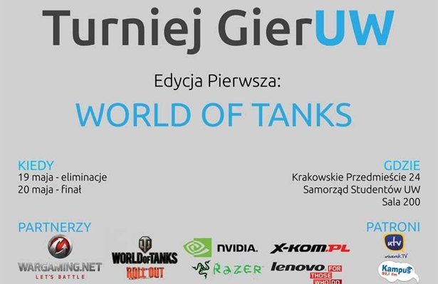 Turniej Gier UW w World of Tanks odbędzie się w przyszły weekend w dniach 18-19 maja w Warszawie w budynku Samorządu Studenckiego przy ulicy Krakowskie Przedmieście 24. Rozgrywki rozpoczną się o godzinie 12:00 w sali konferencyjnej nr 200 i potrwają do godziny 20:00.