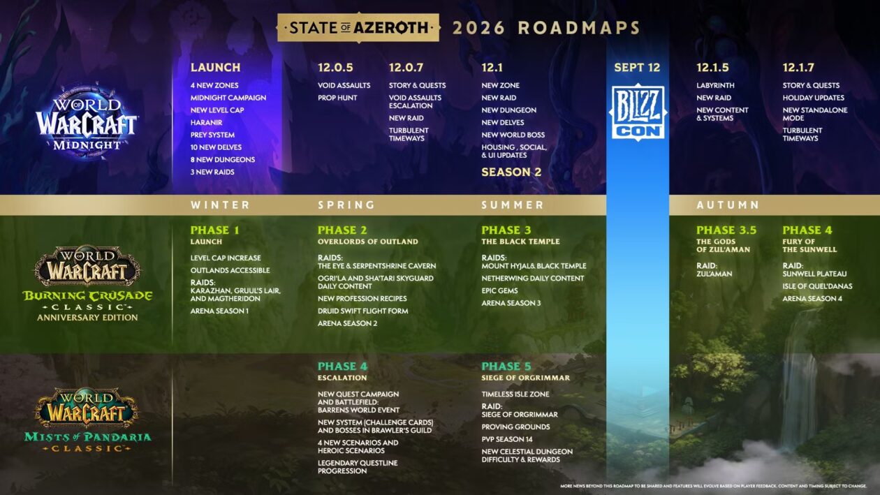 Po pierwsze – i co chyba najbardziej przydatne w obecnej chwili – dostaliśmy roadmapę pokazującą nam plany Blizzarda co do rozwoju MMO. W dodatku mamy tu wgląd nie tylko w sam dodatek Midnight, ale także kolejną zawartość, jaka wkrótce trafi do World of Warcraft Classic. Chodzi tu o wszystko związane z dodatkami Burning Crusade oraz Mists of Pandaria.