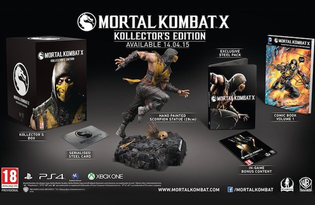 Po pierwsze: Mortal Kombat X Kollector’s Edition, które widzicie powyżej, zawierać będzie stalową kartę, steelbook, pierwszy numer komiksu Mortal Kombat X, bonusową zawartość cyfrową (Kombat Pack – cztery dodatkowe postacie) oraz ręcznie malowaną figurkę Scorpiona. Wygląda rewelacyjnie!