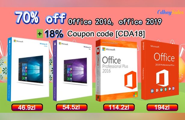 Na stronie Cdkeysales.com można obecnie kupić Office 2016 i Office 2019 z 70% zniżką, którą zwiększymy o kolejne 18% dzięki kodowi rabatowemu [CDA18]. Po jego zastosowaniu możemy nabyć różne rodzaje pakietów Office 2016 i 2019 w atrakcyjnych cenach (wszystkie kwoty poniżej odzwierciedlają cenę po 18% rabacie):