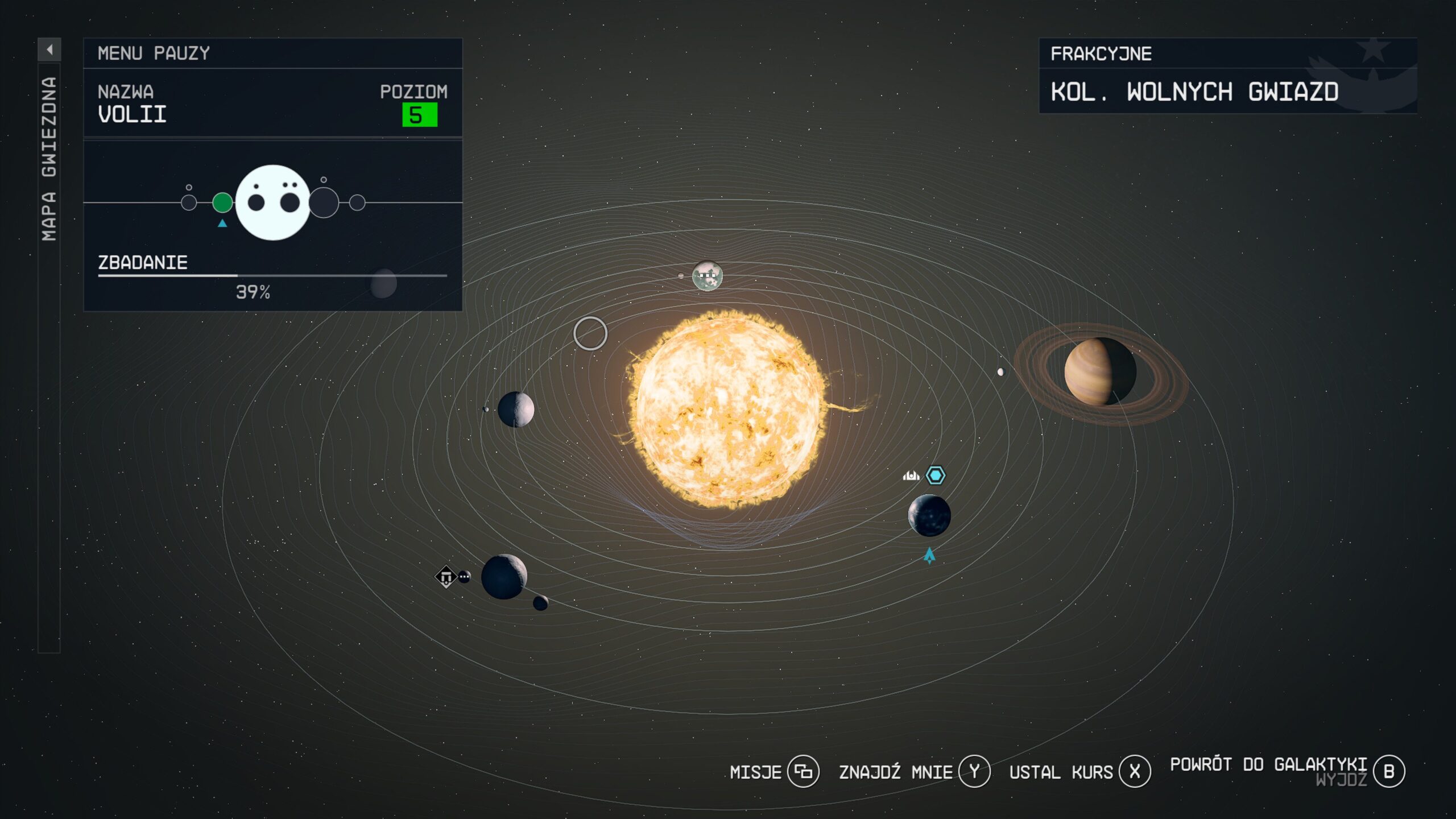 To nie koniec – kiedy mamy otworzony widok planety, po wciśnięciu B/ESC nie przechodzimy do głównego menu, tylko do mapy całego Układu, gdzie możemy ustalić kurs do innych ciał niebieskich w jego obrębie. Plusem takiego rozwiązania jest to, że nie trzeba wtedy wracać na statek kosmiczny. A co powiecie na to, że po ponownym wduszeniu B albo ESC na ekranie mapy gwiezdnej przenosimy się do jeszcze jednej zakładki? Właśnie tak, w ten sposób otrzymujemy dostęp do ogromnej galaktyki. Z tego miejsca możemy wykonać skok grawitonowy do innego Układu – wystarczy wybrać destynację, a następnie przytrzymać przycisk X na padzie bądź R na klawiaturze. Niestety z poziomu galaktyki nie jesteśmy w stanie wrócić do widoku powierzchniowego, planetarnego lub Układu. Trzeba wyjść całkowicie ze wszystkich map i ponownie je uruchomić.