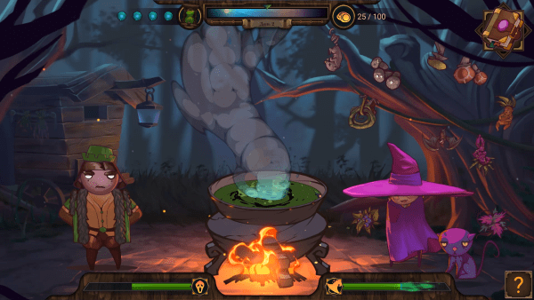 Warzenie mikstur magicznych dla mieszkańców miasteczka, krótkie podejścia i różne zakończenia – oto The Witch’s Cauldron w pigułce. Zabawa bazuje na prostym craftingu z paru składników na krzyż, z których do kotła zawsze trafiają trzy, oraz balansowaniu dwóch wskaźników: grozy i sławy. Te ostatnie nie mogą być ani za niskie, ani za wysokie, co z jednej strony osiągnąć raczej łatwo, a z drugiej bywa nieintuicyjne. Po dwóch „runach”, w czasie których bawiłam się w dobrą czarownicą pomagającą lokalnej społeczności, postanowiłam zostać złą wiedźmą i nie ukrywam, że nie zawsze rozumiałam, dlaczego dwa wspomniane paski zachowują się w określony sposób. Dałam truciznę lub eliksir nieszczęścia komuś, kto na to nie zasłużył – dlaczego groza spadła lub wcale się nie ruszyła, a nie wzrosła? Podobnie niepojęte było dla mnie zdobywanie monet, bo w ciągu trzech godzin ani razu nie miałam możliwości ich użyć, a także przygotowywanie niemal bezużytecznych niemagicznych posiłków. Najwięcej przyjemności sprawił mi zdecydowanie początek gry, kiedy odkrywałam nowe przepisy, np. na zmianę głosu albo fruwanie – miłym gestem ze strony developerów było zaimplementowanie rozpiski wykorzystanych i niewykorzystanych kombinacji.