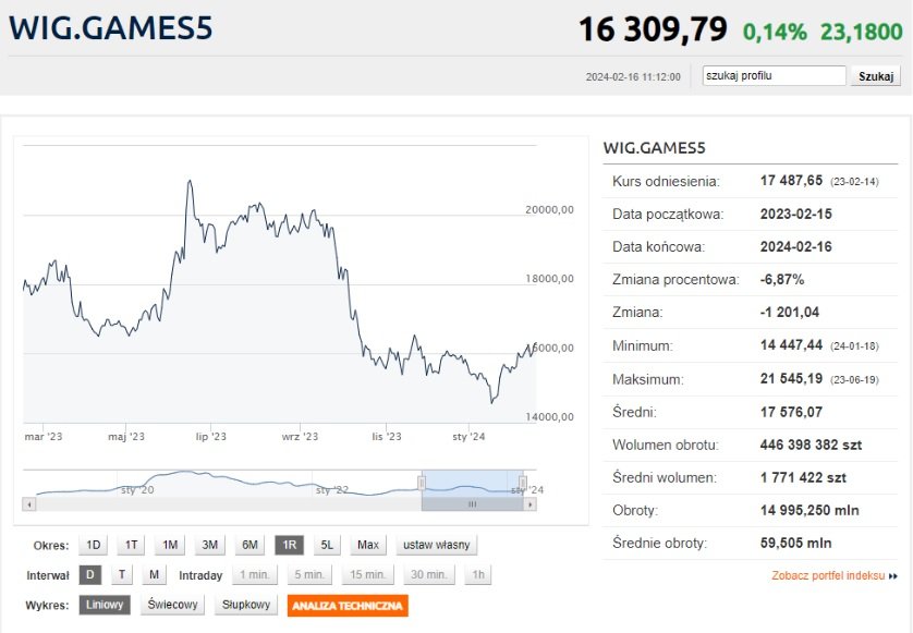 To niejedyny opis tego typu, który mi przedstawiono. Gamedev mocno się nasycił przez ostatnie lata, teraz branża ewidentnie zwalnia. Projekty się zamraża lub anuluje, a inwestorzy wycofują się z giełdy. Widać to zwłaszcza po indeksie WIG Games. Sam WIG (Warszawski Indeks Giełdowy) jest barometrem nastrojów na giełdzie, pozwala rozeznać się w tym, jaka atmosfera panuje na rynku. WIG Games skupia notowanych producentów gier wideo i… cóż, trudno powiedzieć, by w ostatnich miesiącach branża cieszyła się dobrą estymą.