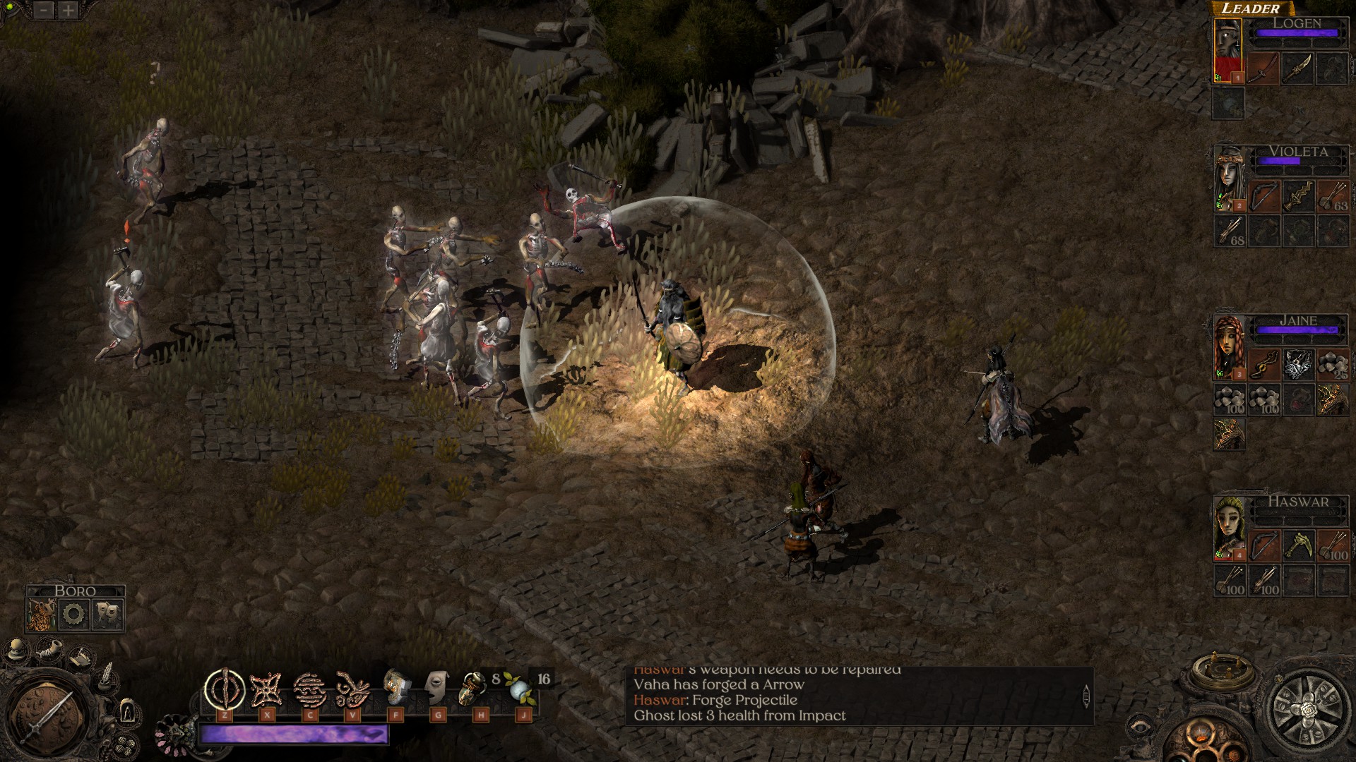 Potyczki to zresztą jeden z wyróżników Banquet for Fools. Cechuje je niezły feedback podczas ciosów jak na tak „spokojny” sposób prezentacji gry, a poza tym okazują się całkiem dynamiczne. Wymagają taktycznego i buildowego przygotowania, a zręczność i reagowanie na bieżąco mają znaczenie. Naraz kontrolujemy tylko jednego członka drużyny, pozostali automatycznie walczą według wybranego skryptu – i zazwyczaj nieźle im to wychodzi. Gdy aktywujemy pauzę (domyślnie pod prawym przyciskiem myszy), jednocześnie rośnie wokół nas „banieczka” informująca, jaki mamy zasięg ataku. Ta próba wymyślenia koła na nowo okazała się całkiem udana, bo po godzinie czy dwóch walka zaczyna autentycznie bawić – także ta na wodzie, kiedy po jakimś czasie dostajemy łódkę, dzięki której docieramy do wcześniej niedostępnych regionów oraz staczamy bitwy… no, bardziej rzeczne, ale powiedzmy, że morskie.