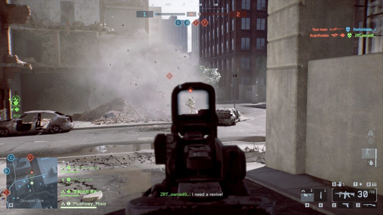 Z jednej strony dostępne obszary są zaprojektowane naprawdę rewelacyjnie. Uliczki, schodki, przejścia pomiędzy budynkami dają dużo możliwości manewrowania po polu walki i flankowania sił przeciwnika. Co równie ważne, sprawiają one wrażenie faktycznie istniejących miejscówek a nie scenografii pod starcia, co potęguje immersję. Warto też w tym miejscu pochwalić rewelacyjny system zniszczeń otoczenia. Kiedy porównamy sobie wygląd mapy z początku i końca meczu, to trudno nie być pod wrażeniem jak wiele elementów ulega destrukcji. I nie jest to jedynie zabieg kosmetyczny. Wyburzone ściany tworzą nowe przejścia, ale też często zmuszają do zmiany taktyki i poszerzenia pola obrony punktu.