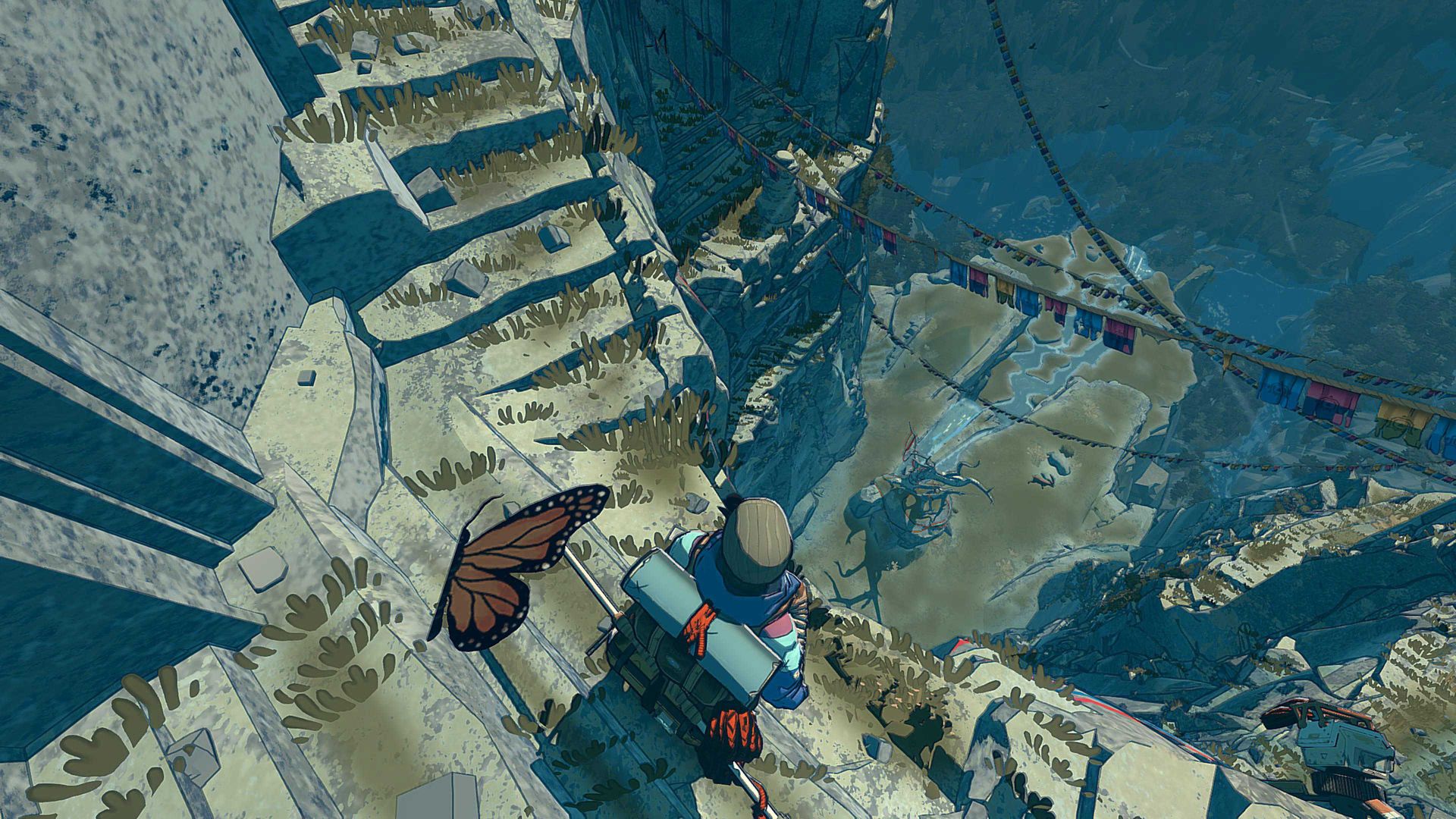 A skąd tyle żarcia i picia u podnóży Kami? Część znajdziemy na niżej położonych szlakach turystycznych w potłuczonych automatach. Czasem przyjdzie nam się zabawić w wędkarkę, z kolei czerpanie wody ze źródełek to już mus. Ponadto górę zamieszkiwała niegdyś cywilizacja Troglodytów, a więc pozostałości po niej również pomagają nam napełnić plecak i żołądek (znajdziemy też malowidła i listy zarysowujące światotwórczo grę czy artefakty ułatwiające dynamiczną wspinaczkę). I właśnie tutaj kluczowa okazuje się wspomniana wcześniej eksploracja, w zbalansowany sposób urozmaicająca rozgrywkę, a jeśli wystarczająco dokładna, to i nagradzająca, czy to rozmową z enpecem, czy to zadaniem pobocznym, czy to trudną do zapomnienia lokacją.
