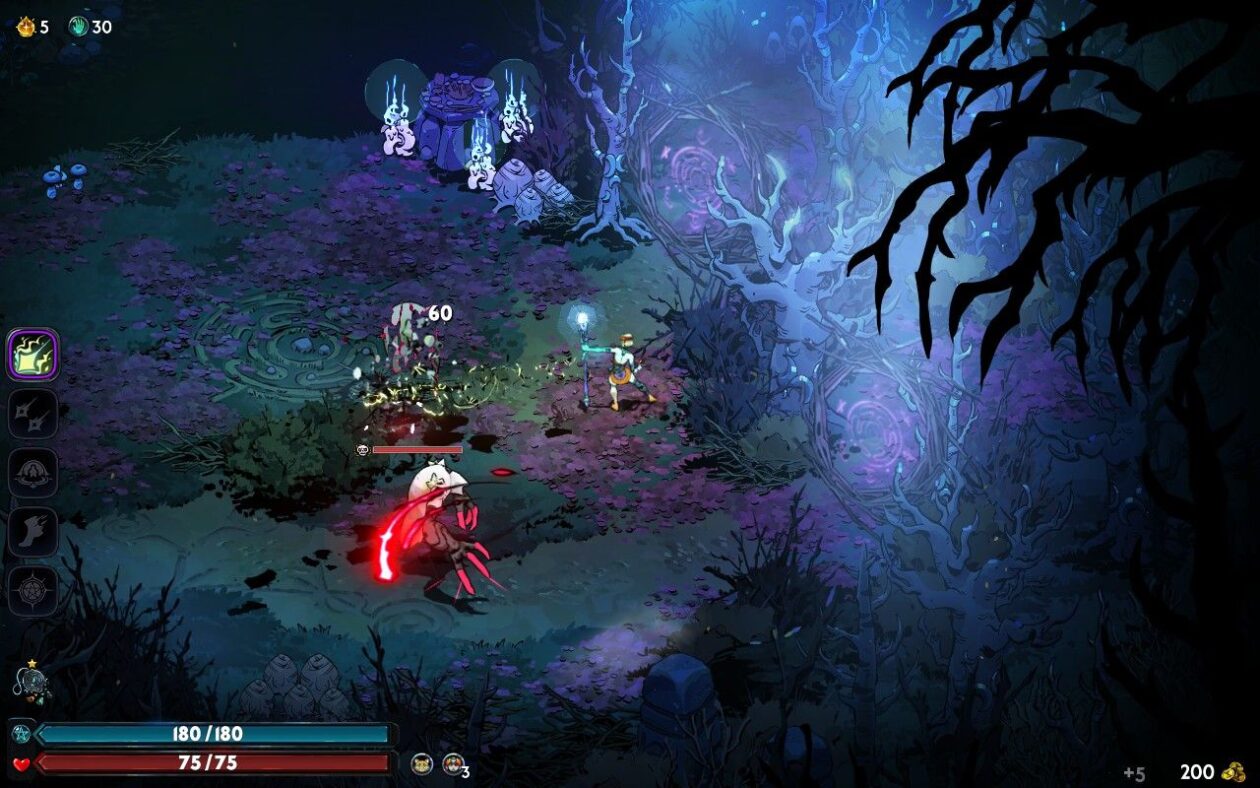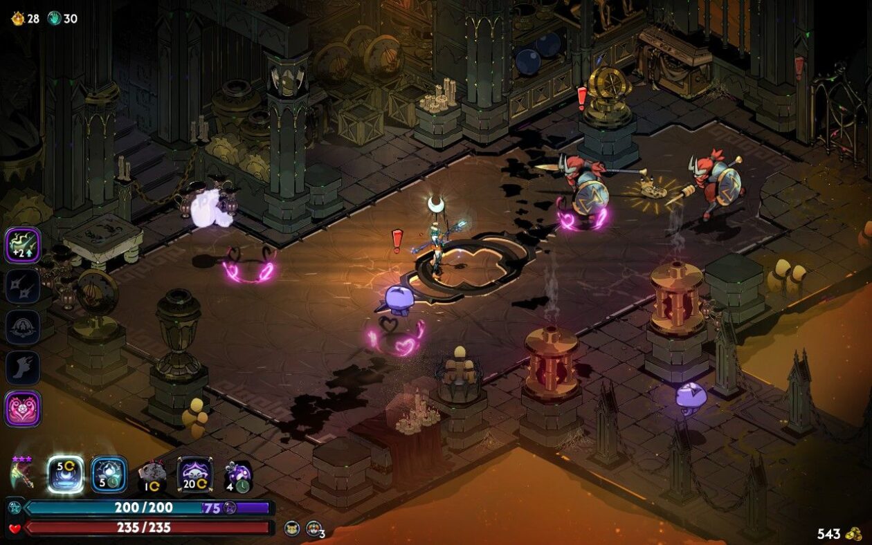 Jak w pierwszej części, tak i w tej mamy dostęp do kilku rodzajów uzbrojenia. Co ważne – wszystkie bronie są diametralnie inne od tych Zagreusa. Zamiast mieczem Melinoë włada wiedźmim kosturem, łuk został zaś zastąpiony przez dwie różdżki wystrzeliwujące magiczne kule. Prócz tego możemy zaopatrzyć się w wielki (a zarazem ślamazarny) topór, wybuchowe czaszki, sztylet i sierp pozwalające na wykonywanie szybkich sztychów oraz mojego faworyta – egzoszkielet ze wbudowaną wyrzutnią rakiet.