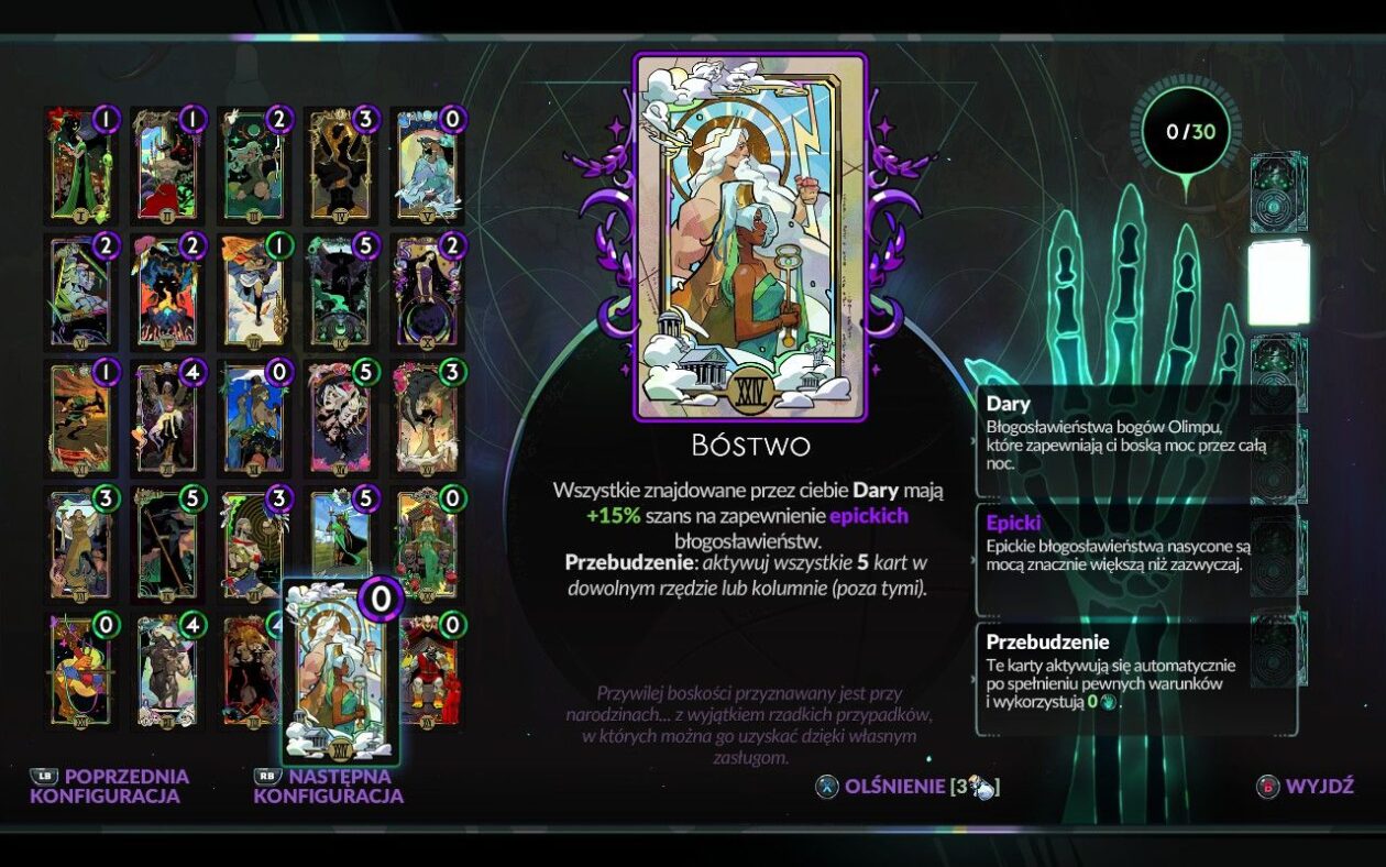 Są to m.in. serca podnoszące liczbę punktów życia, fiolki doładowujące manę, ale także dary od bogów modyfikujące w znacznym stopniu zdolności Melinoë. Przykładowo, Zeus jest w stanie obdarować nas mocą rażenia piorunami wrogów, którzy ośmielili się podnieść rękę na córkę Hadesa, zaś Posejdon zmienia nasz sprint w potężną falę odrzucającą i raniącą niemilców. Kombinacji i potencjalnych połączeń przygotowano tu multum, a odkrycie ich wszystkich to zajęcie na ponad setkę godzin.
