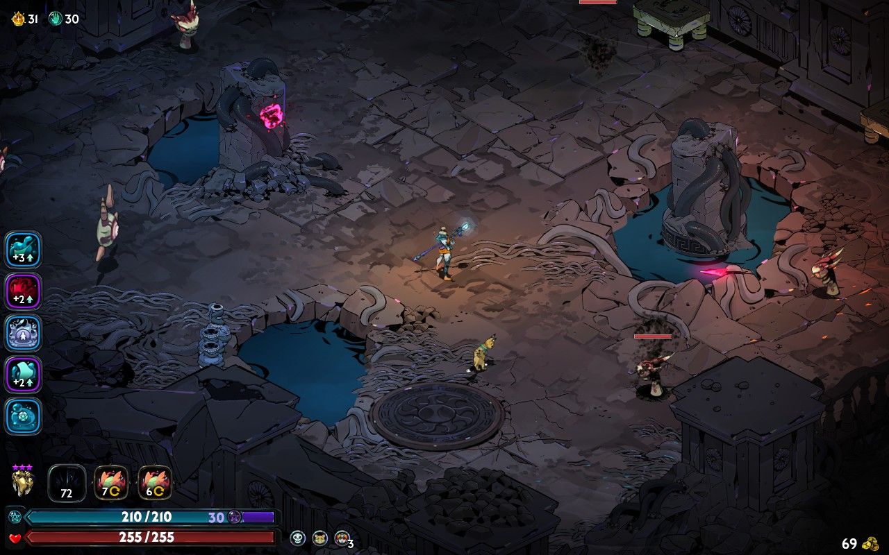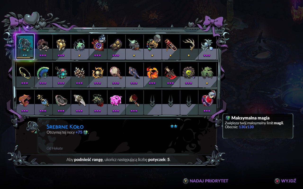 Są to m.in. serca podnoszące liczbę punktów życia, fiolki doładowujące manę, ale także dary od bogów modyfikujące w znacznym stopniu zdolności Melinoë. Przykładowo, Zeus jest w stanie obdarować nas mocą rażenia piorunami wrogów, którzy ośmielili się podnieść rękę na córkę Hadesa, zaś Posejdon zmienia nasz sprint w potężną falę odrzucającą i raniącą niemilców. Kombinacji i potencjalnych połączeń przygotowano tu multum, a odkrycie ich wszystkich to zajęcie na ponad setkę godzin.