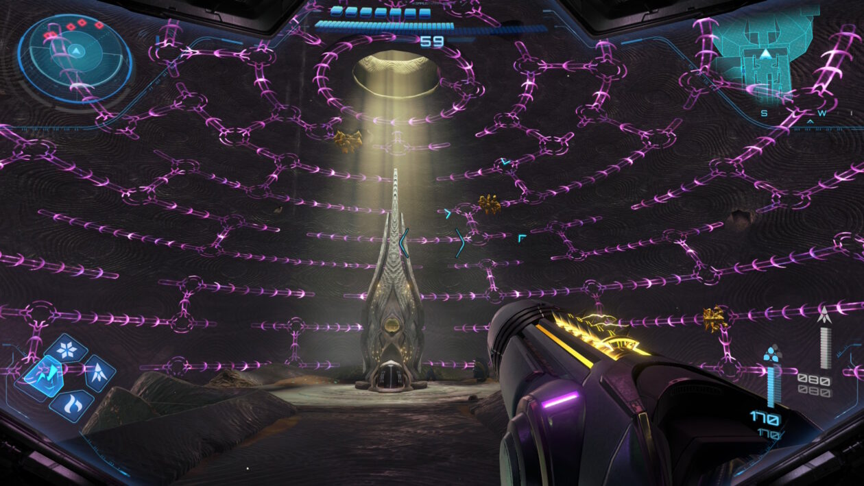 Z czysto technicznego punktu widzenia najlepiej jest grać w Metroida Prime 4 na Nintendo Switchu 2 – tytuł oferuje wybór dwóch trybów graficznych. W Quality Mode dostajemy rozdzielczość 4K, 60 fps oraz bardziej szczegółowe tekstury i efekty cząsteczkowe, a w Performance Mode – 1080p w aż 120 klatkach na sekundę. Za całkiem fajny bajer należy też uznać możliwość celowania przy pomocy joyconowej „myszki”, chociaż korzystanie z namierzania (lock-on) jest tak charakterystycznym elementem cyklu Prime, że nie wyobrażam sobie, by strzelać inaczej. Zadowoleni powinni być również posiadacze starszych Switchy, które co prawda obsługują Beyond w dynamicznej rozdzielczości, ale celują w stabilną rozgrywkę w 60 klatkach. To miła odmiana po Hyrule Warriors: Age of Calamity, najnowszych Zeldach czy Pokémon Scarlet/Violet.