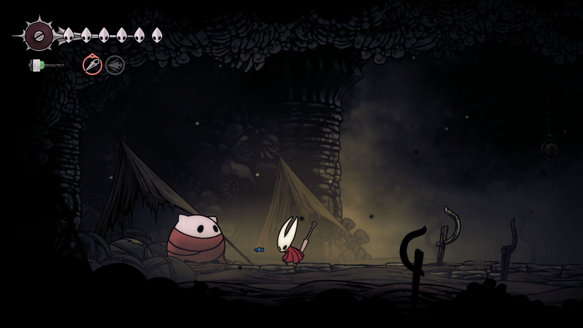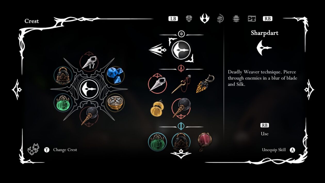 Ponadto każdy z herbów dysponuje inną liczbą wyróżnionych kolorem gniazd na dane umiejki. Białe sloty przeznaczono na zdolności aktywne (do których użycia potrzebujemy zdobytego po drodze jedwabiu, wydawanego również na leczenie), żółte związane są z perkami pomagającymi w eksploracji, niebieskie skille zapewniają bonusy do obrony, a czerwone to kolejna odrębna mechanika, czyli tzw. narzędzia – proste dodatki w formie różnego rodzaju miotanych noży, odbijających się od płaszczyzn stożków czy samonaprowadzających mechanicznych żuków. Pomagają znacząco, zwłaszcza podczas trudniejszych walk, ale dysponujemy ograniczoną amunicją, warunkowaną ilością posiadanej waluty w formie kryształów.