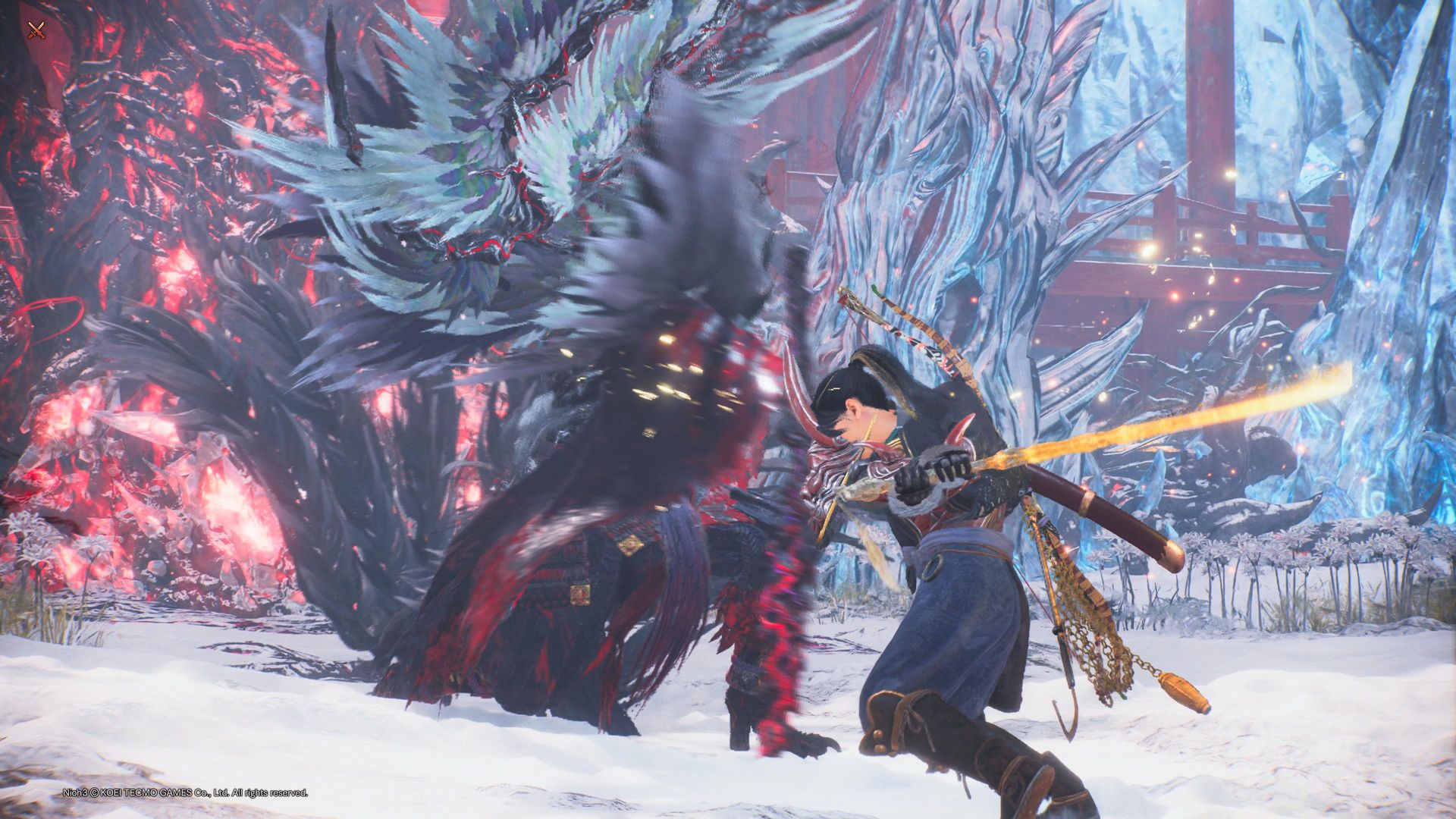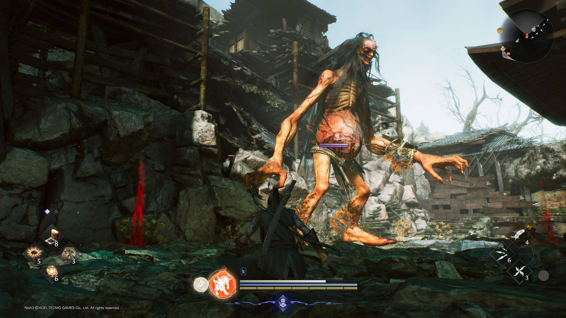 Główny bohater, znany jako Tokugawa Takechiyo, choć potrafi porozumiewać się w tradycyjny sposób, gada niezwykle rzadko, ograniczając się do jęknięć, stęknięć oraz westchnięć. Najczęściej stosowanym środkiem komunikacji protagonisty (albo protagonistki) jest jednak oręż, a jego typów mamy do wyboru, do koloru: od samurajskich mieczy, przez włócznie i naręczne szpony, po kusarigamy, czyli sierpy z obciążnikiem na łańcuchu. Posługiwanie się bronią początkowo nie przychodzi łatwo za sprawą dużej liczby związanych z owym system mechanizmów, których Nioh 3 ewidentnie nie potrafi wprowadzać stopniowo, zamiast tego od razu rzucając nas na głęboką wodę.