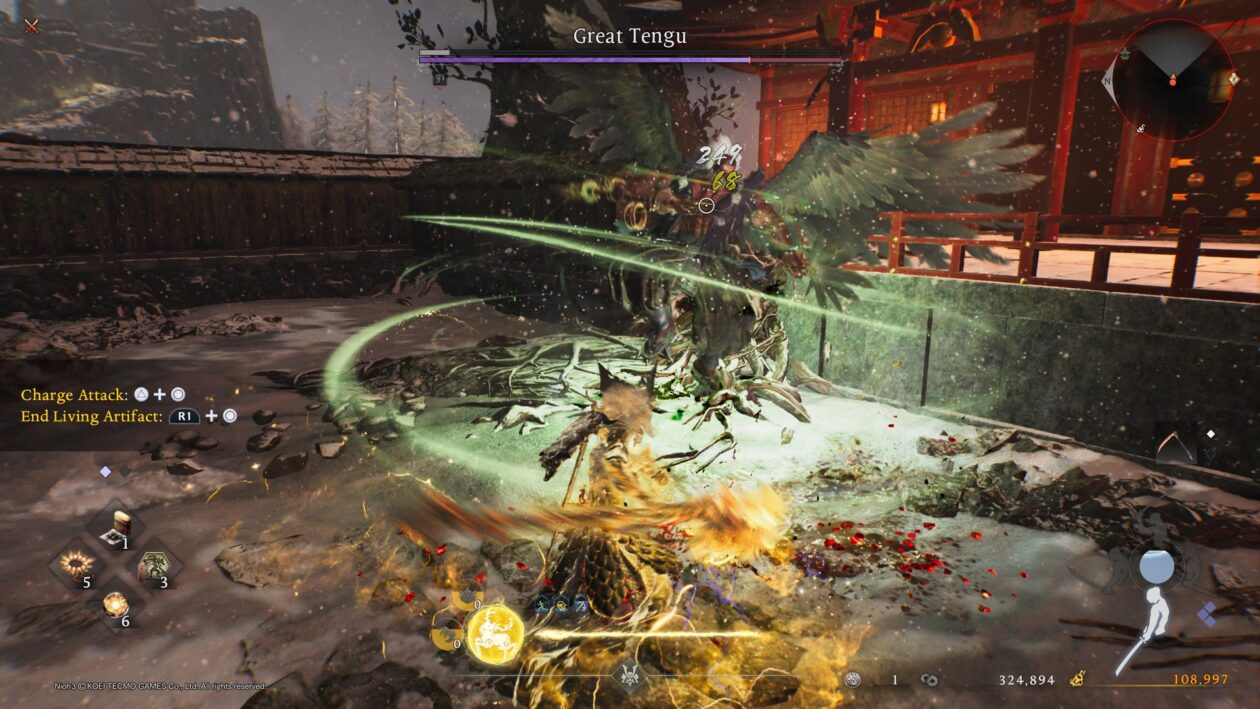 Już pierwszy pojedynek, mający stanowić wprowadzenie do systemu walki, może dać nam w kość. Wczesne etapy zabawy polegają na przypominaniu sobie o istnieniu kolejnych elementów, które da się wykorzystać podczas potyczek i które to zostały nam przedstawione wyłącznie za pomocą jednego z wielu wyskakujących komunikatów tekstowych. Czy pamiętaliśmy o tym, aby po ataku aktywować puls ki i przywrócić część utraconej energii? Czy użyliśmy zdolności towarzyszącego nam ducha opiekuńczego po naładowaniu odpowiedniego zasobu? Albo czaru pozyskanego za sprawą umieszczenia rdzenia oni w naszym wyposażeniu? Opanowanie poszczególnych zagrywek stanowi wyzwanie samo w sobie i choć może wydawać się wręcz niemożliwe, z czasem korzystanie ze sztuczek zaczyna przychodzić nam naturalnie. Szkopuł w tym, iż musimy nauczyć się ich dwukrotnie – wszystko dlatego, że świeży twór Ninja zachęca nas do płynnego przełączania się między zróżnicowanymi stylami.