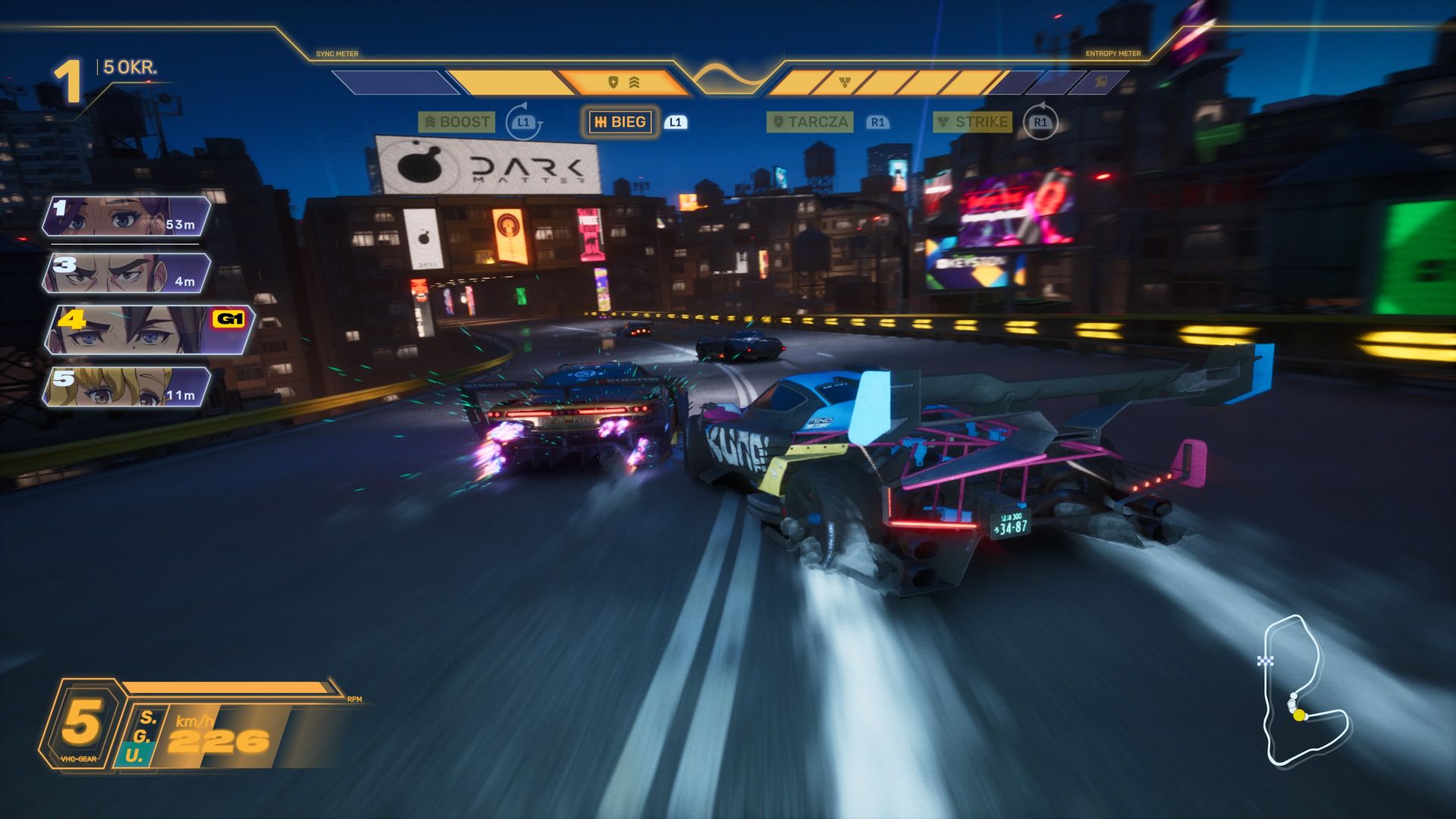 Oprawa audiowizualna prezentuje się rewelacyjnie i z umiarem korzysta z cel-shadingowych bajerów, głównie w elementach pojazdów i wybuchach. Nawet po kilku godzinach zabawy kampania potrafiła mnie zaskoczyć poziomem wykonania kolejnych tras. Miejskie prezentują się cud malina, a momentami, gdy odpalała się mocna „techniawa”, miałem wrażenie, że gram w Cyberpunka 2077 Racing. Basy dudnią w uszach, adrenalina powoduje, że coraz bardziej zaciskam łapy na padzie i jestem całkowicie skupiony, przejeżdżając przez kolejne kolorowe ulice. Czuć prędkość i zarazem ciężkość samochodu.