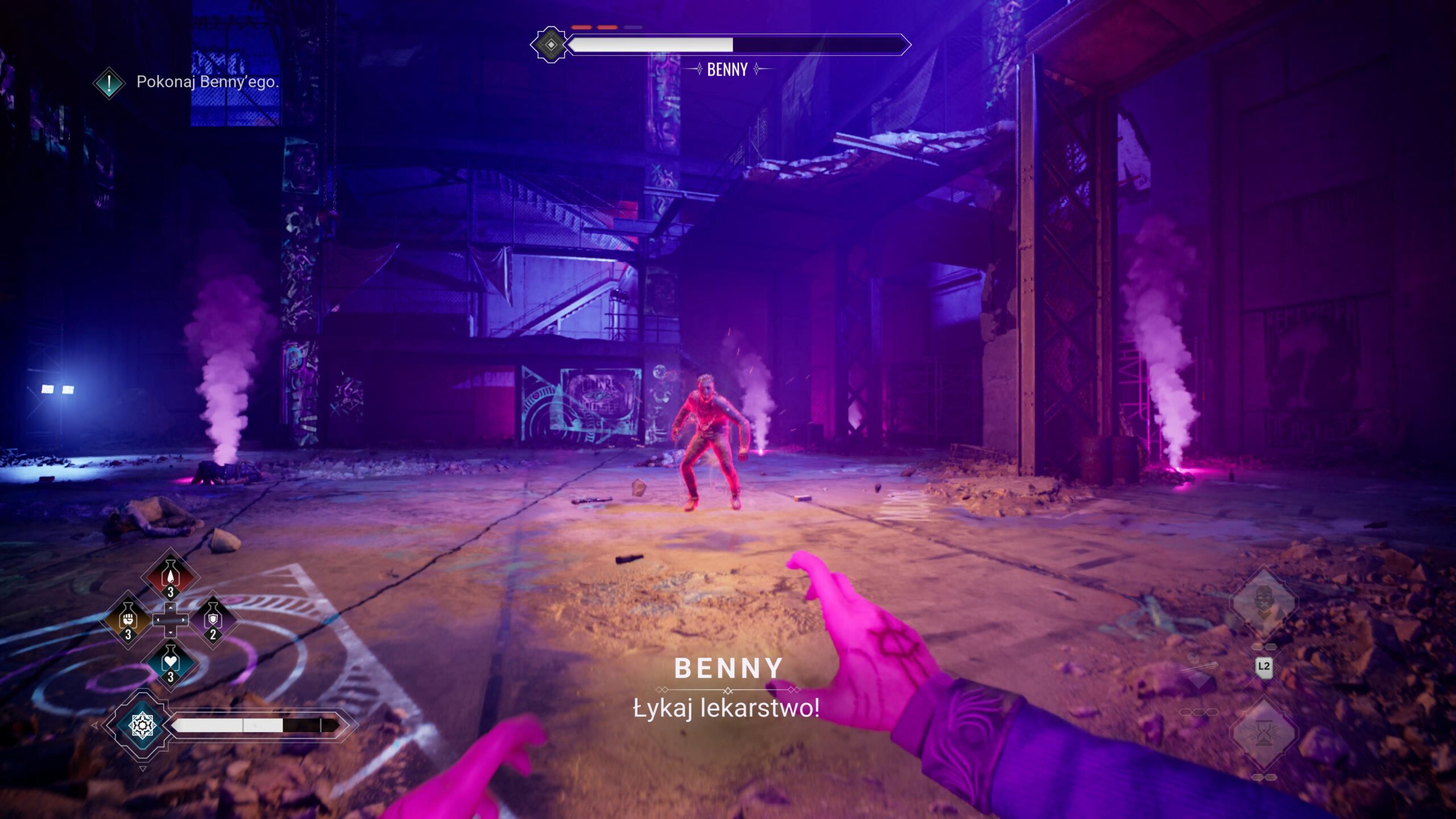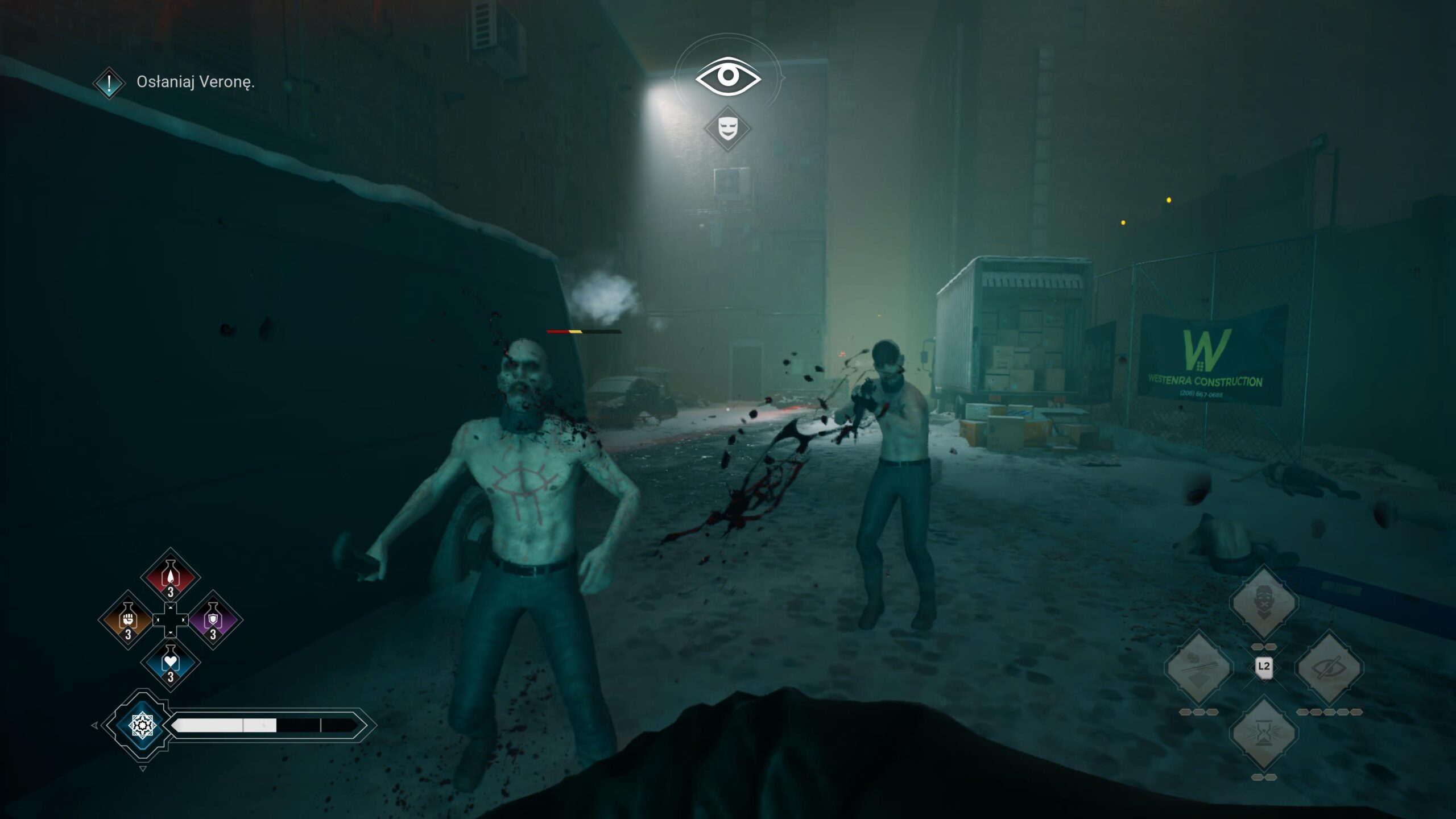 Pomysł to szalenie odważny, zważywszy, że studio nigdy wcześniej nie miało takich mechanizmów w swoich produkcjach. Twórcy dodatkowo skomplikowali sobie zadanie, ograniczając potyczki do starć wręcz, które niełatwo zaprojektować w przekonujący sposób przy FPP. Udało się to bardzo dobrze w Dead Island 2, tam jednak dysponowaliśmy przynajmniej bronią białą, tutaj zaś możemy nią jedynie rzucać przy pomocy telekinezy. I choć cały system jest zaskakująco rozbudowany, trudno nazwać go wygodnym czy satysfakcjonującym. Latanie kamerą za wrogiem, by rzucić się na niego z łapami, toporne uniki oraz brak blokowania sprawiają, że walka szybko frustruje i nawet wachlarz wampirzych mocy tego nie rekompensuje. Swoją drogą, kto wymyślił osobne limity dla każdej z nich?! Jeden pasek krwi traktowanej jak mana sprawdziłby się znacznie lepiej.