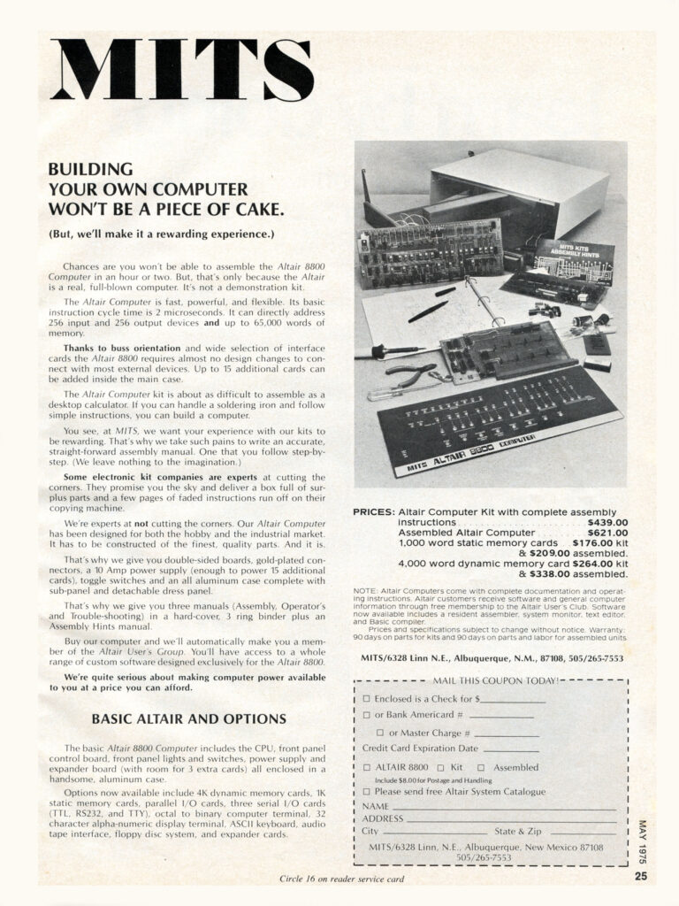W pierwszej połowie lat 70. Popular Electronics było najważniejszym magazynem dla amerykańskich hobbystów elektroniki, z nakładem rzędu 400 tys. egzemplarzy miesięcznie. Mowa o piśmie dla tych maniaków sprzętowych, którzy nie bali się lutownicy. W tym czasie Ed Roberts, założyciel MITS, miał kłopoty finansowe. Jego firma zajmowała się dotąd budową kalkulatorów elektronicznych, ale japońska konkurencja zalewała rynek tańszymi a nie gorszymi produktami. W efekcie MITS znalazło się na skraju bankructwa. Roberts na gwałt potrzebował czegoś nowego, innego pomysłu na biznes.
