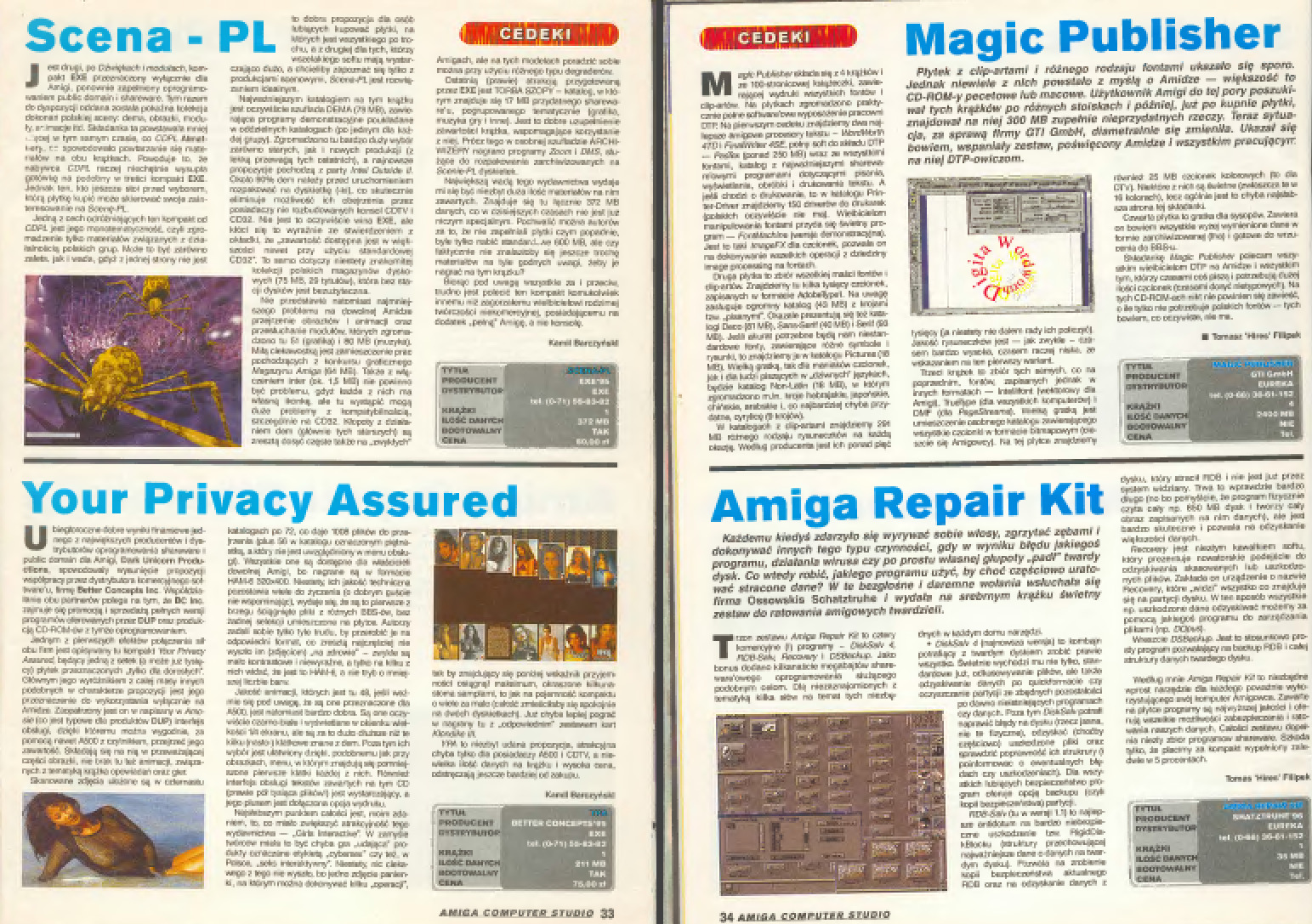 Jak już wspomniałem, CS miał dwa numery specjalne. Pierwszy z nich poświęcono grom PC, a drugi pozycjom na Amigę. Jako że ta edycja została ciepło przyjęta przez amigowców (nierozpieszczanych przez polskich wydawców), w latach 1994-1995 wyszły kolejne tematyczne magazyny, znane pod nazwą Wydanie Specjalne Computer Studio Amiga. Od samego początku WSCSA było w pełni kolorowe i wydawane na zadziwiająco dobrym papierze, znacznie lepszym niż CS. Ba, w sumie jak dla mnie na najlepszym, jakie w ogóle miały wszystkie pisma komputerowe wydawane przez CGS!
