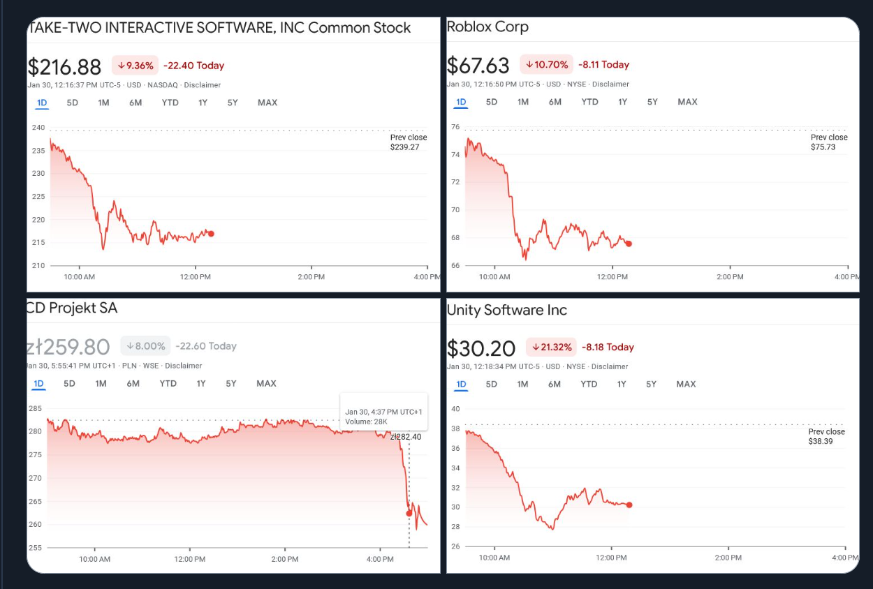 📍Google niedawno zaprezentowało Project Genie 3 – narzędzie AI tworzące realistyczne światy 3D na podstawie promptu. Akcje spółek tworzących gry następnego dnia: