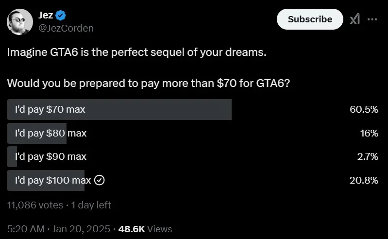 📍 Gry za 70 dolarów – tak to ma ponoć wyglądać po debiucie GTA VI… Gracze twierdzą, że to przesada i nie kupią ich w takiej cenie, będą czekać na obniżki itd. Tak przynajmniej odgrażają się w necie. Ale kogo my oszukujemy? Szykuje się zylion preorderów, a milion ludzi wyda jeszcze ze 20 dolarów więcej na edycję umożliwiającą zagranie na osiem godzin przed oficjalną premierą. Założycie się? PS W ankiecie na Twitterze, w której wzięło udział 11 tys. osób, 60% uznało, że 70 dolców jest okej, sporo deklarowało, że zapłaci nawet i sto. Mogę tylko rozłożyć ręce…