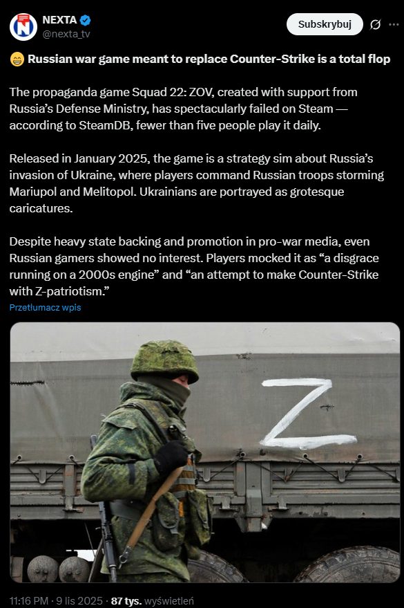 📍 Stworzona przy wsparciu Ministerstwa Obrony Rosji propagandowa gra Squad 22: ZOV, opowiadająca jak to dzielni Rosjanie tłuką nazistowskich Ukraińców, na Steamie dostaje większy wpiernicz niż „druga armia świata” pod Kijowem w 2022. W peaku grało w tytuł 50 graczy. W pół roku po premierze – jakieś kilka osób. Czyli zapewne programista, jego matka, ktoś z ministerstwa i ewentualnie ze dwa boty. Nie wątpię, że sprzedaż nadal przebiega zgodnie z planem, tak jak sama specoperacja.