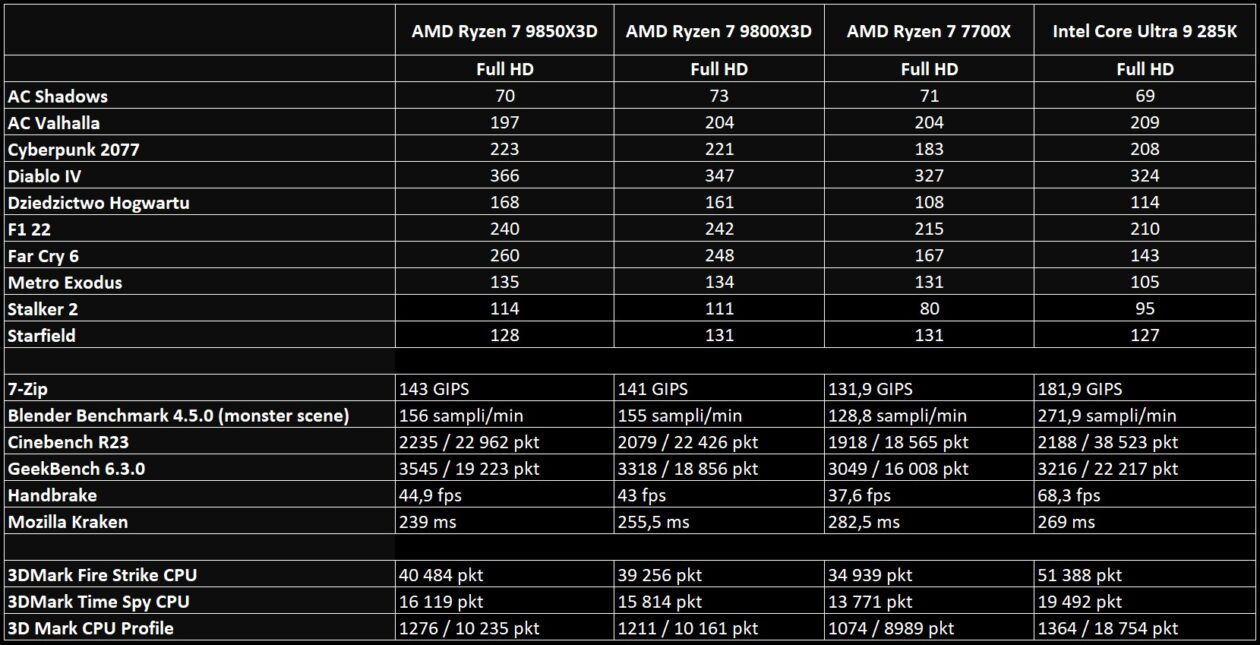Za Intela 285K trzeba obecnie zapłacić ok. 2300 zł. Ryzena 7 9800X3D dostaniemy za ok. 1800 zł, z kolei testowany tu Ryzen 7 9850X3D ma trafić do sklepów w cenie sugerowanej 499 dolarów, co powinno przełożyć się na kwoty zakupu pomiędzy 2150 a 2300 zł w zależności od sklepu. Wnioski są następujące: na razie stawiałbym w dalszym ciągu na Ryzena 7 9800X3D. Jego mocniejszy brat, 9850X3D, jest swego rodzaju kropką nad i oraz pokazem możliwości AMD, tyle że w istocie niewielka różnica w wydajności pomiędzy nimi nie uzasadnia wyższej kwoty zakupu – to bardziej odgrzewany kotlet niż coś naprawdę nowego. Gdyby jednak staniał – można brać. AMD po raz kolejny potwierdziło, że w obecnej generacji procesorów jeńców nie bierze – szkoda tylko, iż na tle własnych układów w tak mało spektakularny sposób.
