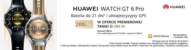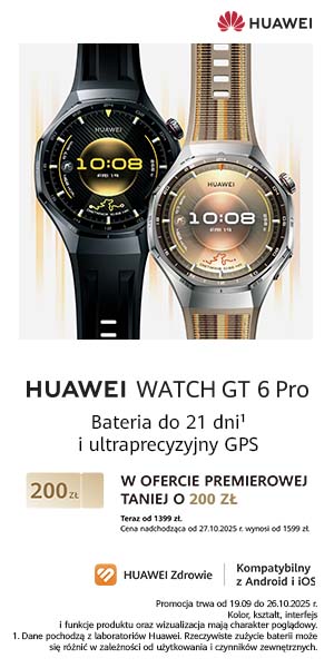 Na koniec warto dodać, że smartwatch HUAWEI WATCH GT 6 Pro 46 mm trafia do sprzedaży w trzech opcjach: Active – z paskiem z fluoroelastomeru, Safari – z plecionym brązowym paskiem, który łączy sportowy styl z elegancją, lub pasujący do garnituru Elite, gdzie zastosowano tytanową bransoletę. Jeśli zdecydujecie się na zakup do 26.10, to zegarek możecie kupić o 200 zł taniej. Ponadto w tym okresie opcjonalny abonament Watch Face dostępny jest za pół ceny. Więcej informacji znajdziecie na stronie producenta.