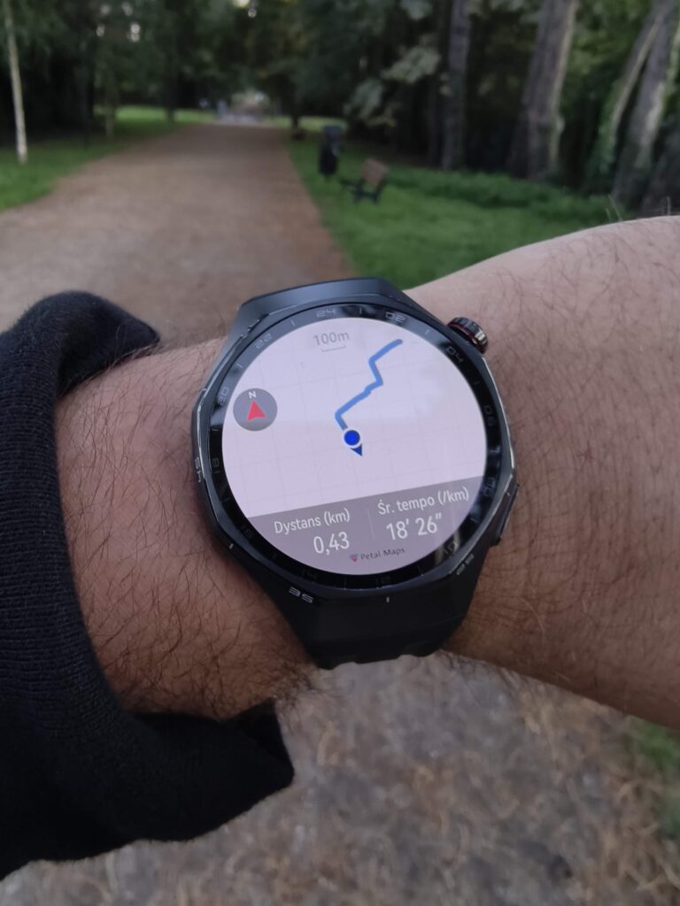 Oczywiście na tym „sportowe” opcje zegarka się nie kończą: urządzenie potrafi monitorować przeszło setkę aktywności, w tym takie, które zapisują przebytą przez nas drogę. Niezależnie od tego, czy jest to np. bieganie, czy spacer z psem, zawsze mogłem liczyć na komplet danych, które pozwoliłyby mi później prześledzić kolejne treningi i ich trasy – również na bieżąco, gdyż zegarek potrafi w czasie rzeczywistym dzielić się z nami wszystkimi potrzebnymi informacjami, w tym mapą zapisanej dzięki dokładnego GPS-a trasy.