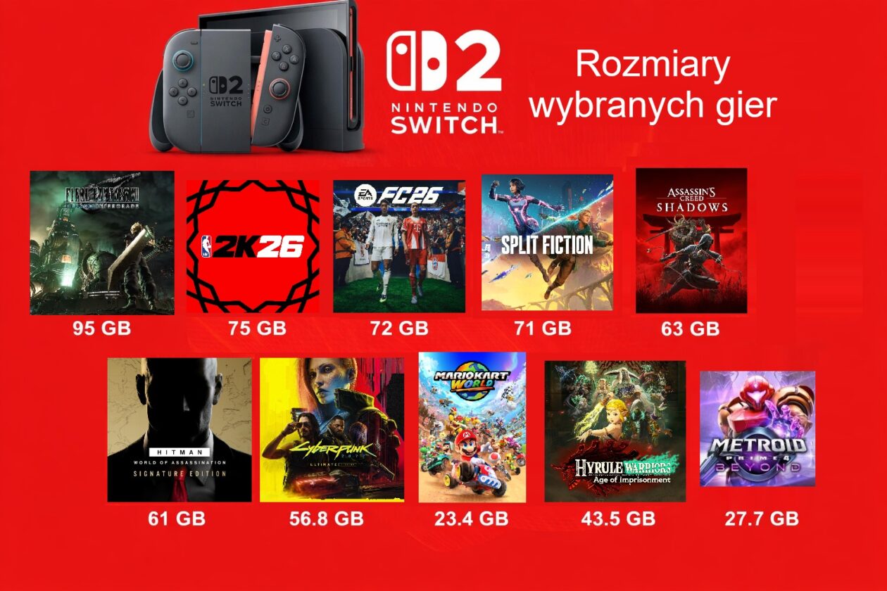 Wystarczy spojrzeć na rozmiary gier dostępnych na Switchu 2, by zauważyć, że głównymi „zapychaczami” pamięci są produkcje zewnętrznych wydawców. Final Fantasy VII Remake Intergrade – 95 GB, NBA 2K26 – 75 GB, EA Sports FC 26 – 72 GB, Split Fiction – 71 GB, Assassin’s Creed Shadows – 63 GB, HITMAN World of Assassination Signature Edition – 61 GB, Cyberpunk 2077: Ultimate Edition – 56,8 GB. Gdyby ktoś chciał zainstalować je wszystkie, potrzebowałby ok. 493,8 GB wolnego miejsca w pamięci wewnętrznej i na karcie.