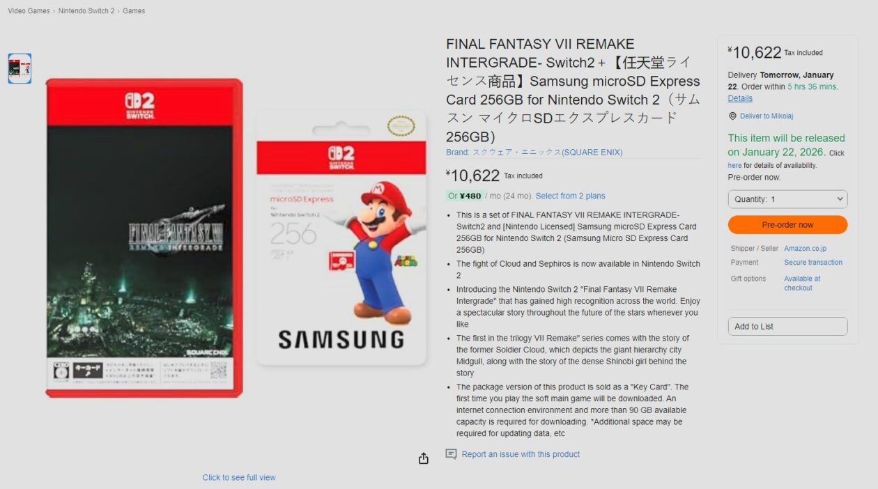Kilka dni temu śmiałem się w rozmowach z kolegami, że zaraz w sklepach pojawią się zestawy z grą pokroju Final Fantasy VII Remake Intergrade i kartą pamięci, bo ludziom zwyczajnie zacznie brakować miejsca na konsolach. Jakie było moje zdziwienie, gdy odkryłem, że na japońskim Amazonie faktycznie można kupić taki komplet: FF VII Remake wraz z kartą 256 GB, i to w całkiem sensownej cenie.