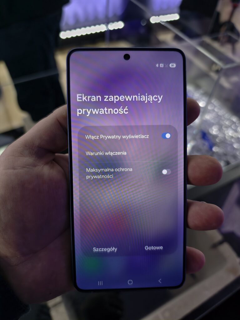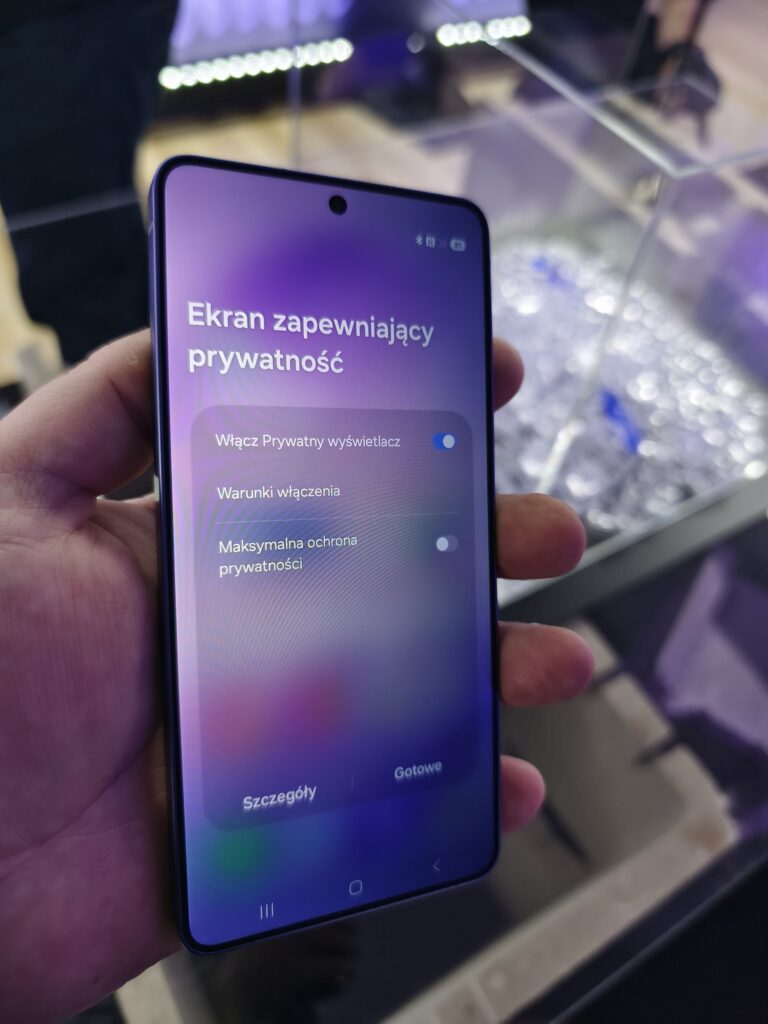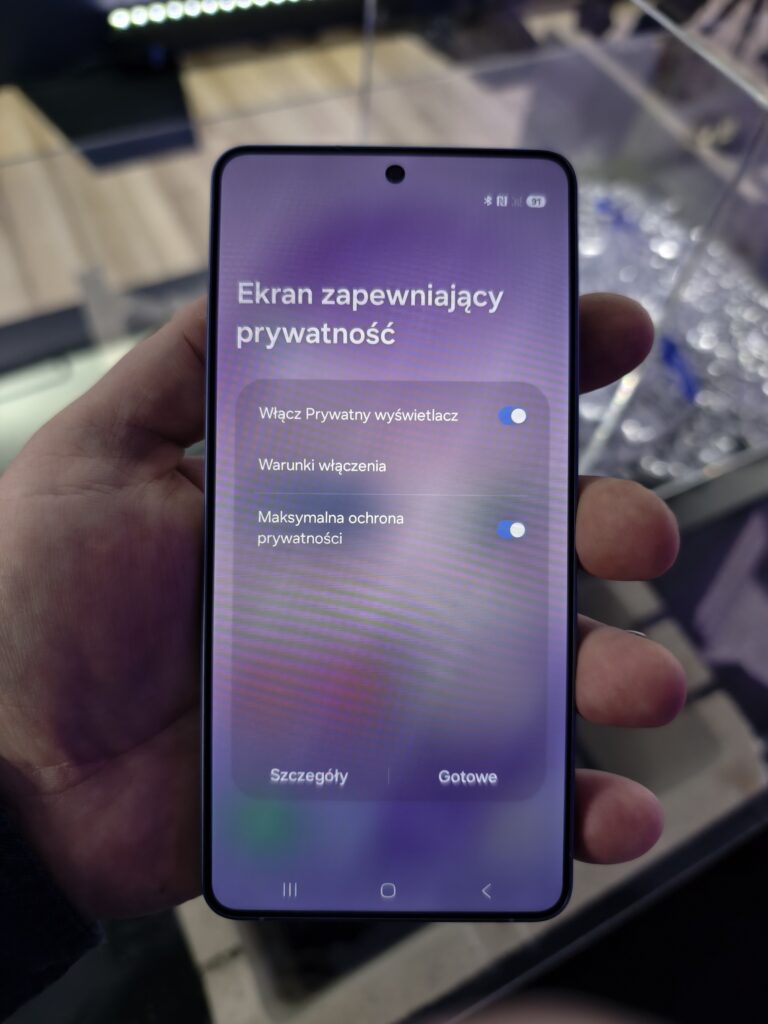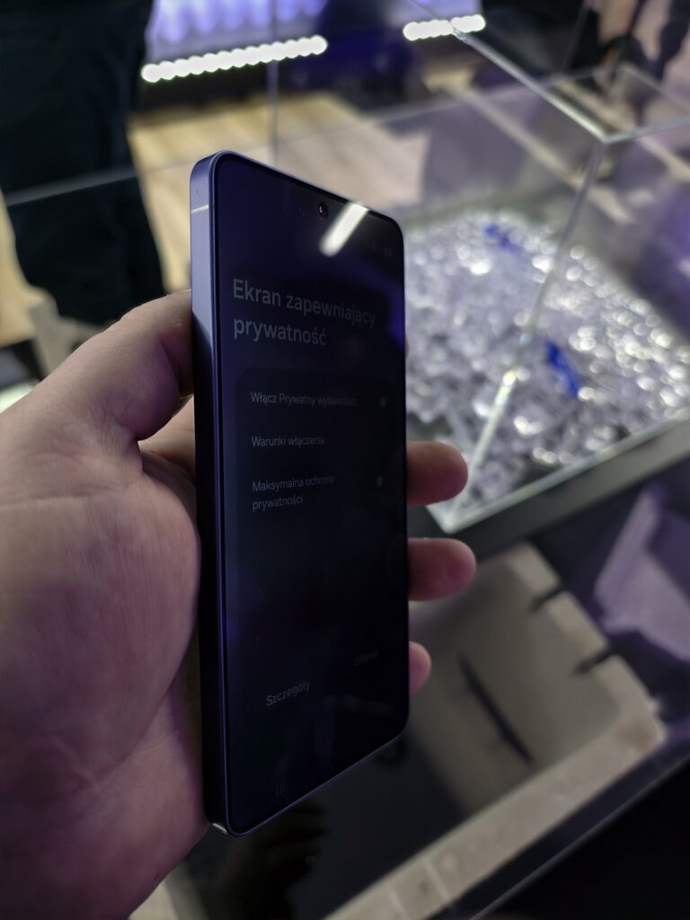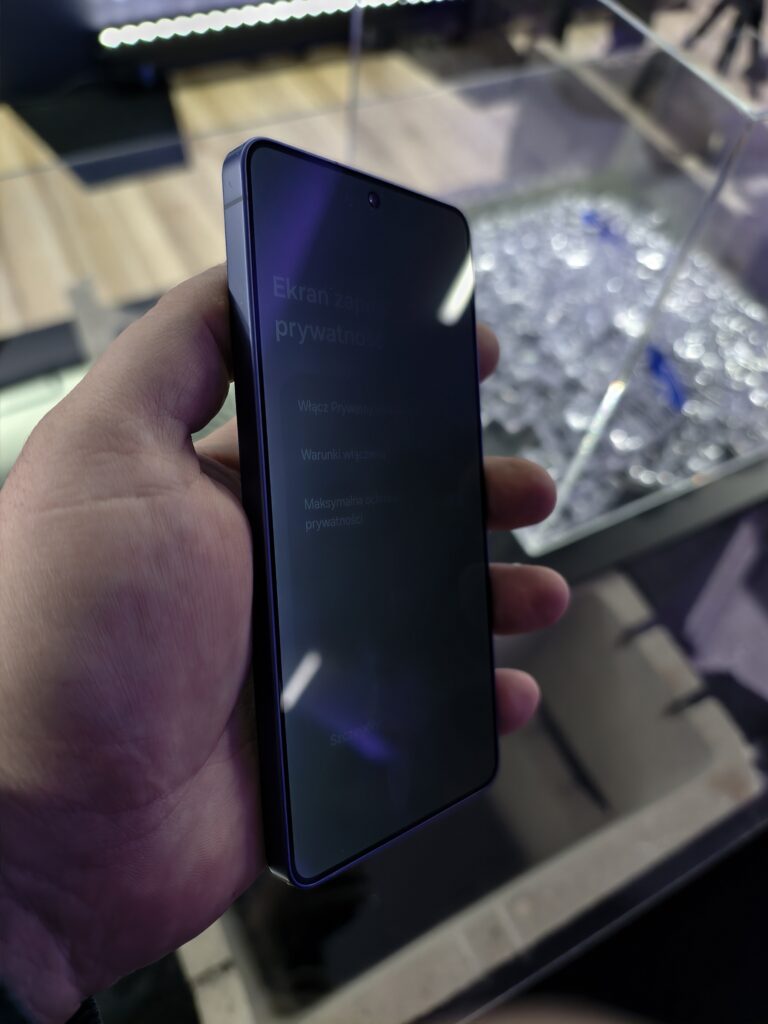 Największa nowinka ucieszy tych, którzy chcą kupić najmocniejszy model z serii i cenią sobie prywatność, np. w komunikacji miejskiej czy sklepie. Korzystając z odpowiedniej funkcji w menu wysuwanym z górnej belki, możemy włączyć specjalny tryb pracy ekranu, który najprościej chyba opisać jako redukcję kątów wyświetlania. Gdy tak zrobimy, osoba stojąca z boku zobaczy na naszym telefonie w zależności od swojej pozycji albo obraz znacząco przyciemniony, albo wręcz ciemną taflę przodu urządzenia – przez co odczytanie tego, na co my spoglądamy, staje się niemożliwe.