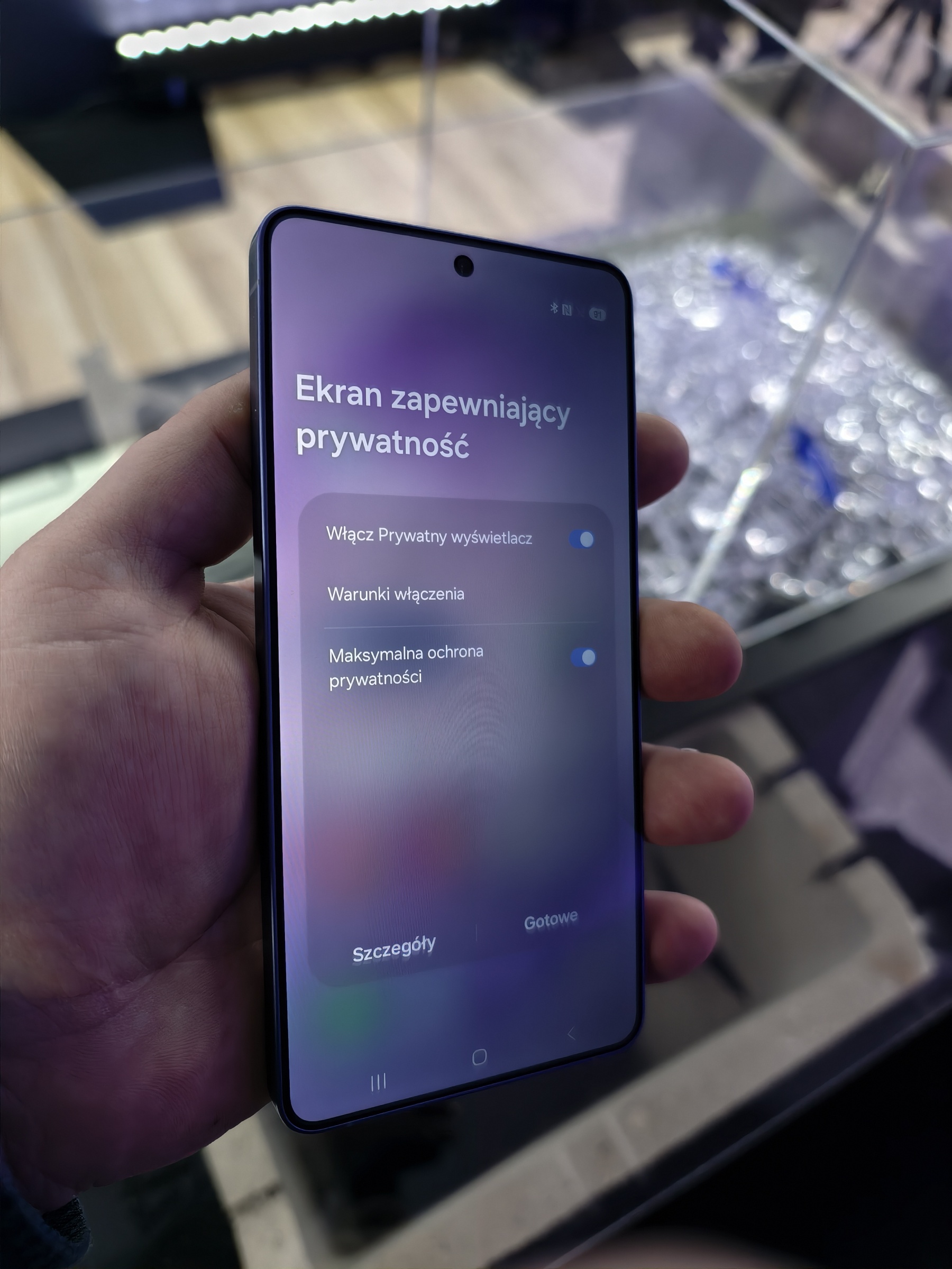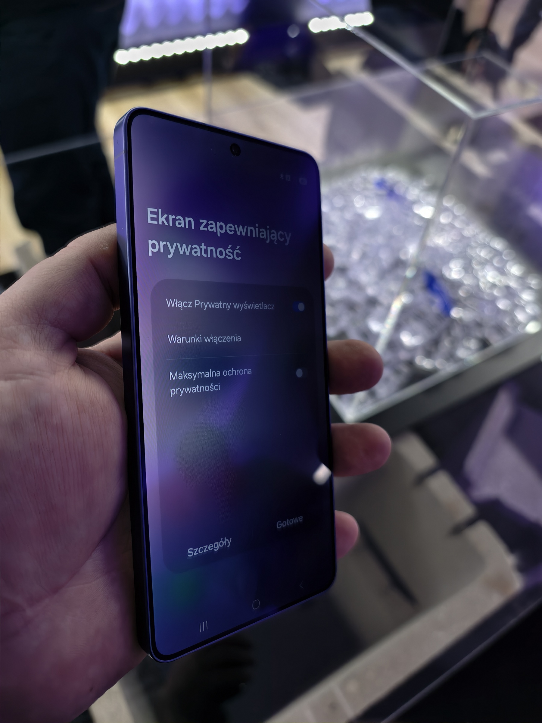 Największa nowinka ucieszy tych, którzy chcą kupić najmocniejszy model z serii i cenią sobie prywatność, np. w komunikacji miejskiej czy sklepie. Korzystając z odpowiedniej funkcji w menu wysuwanym z górnej belki, możemy włączyć specjalny tryb pracy ekranu, który najprościej chyba opisać jako redukcję kątów wyświetlania. Gdy tak zrobimy, osoba stojąca z boku zobaczy na naszym telefonie w zależności od swojej pozycji albo obraz znacząco przyciemniony, albo wręcz ciemną taflę przodu urządzenia – przez co odczytanie tego, na co my spoglądamy, staje się niemożliwe.