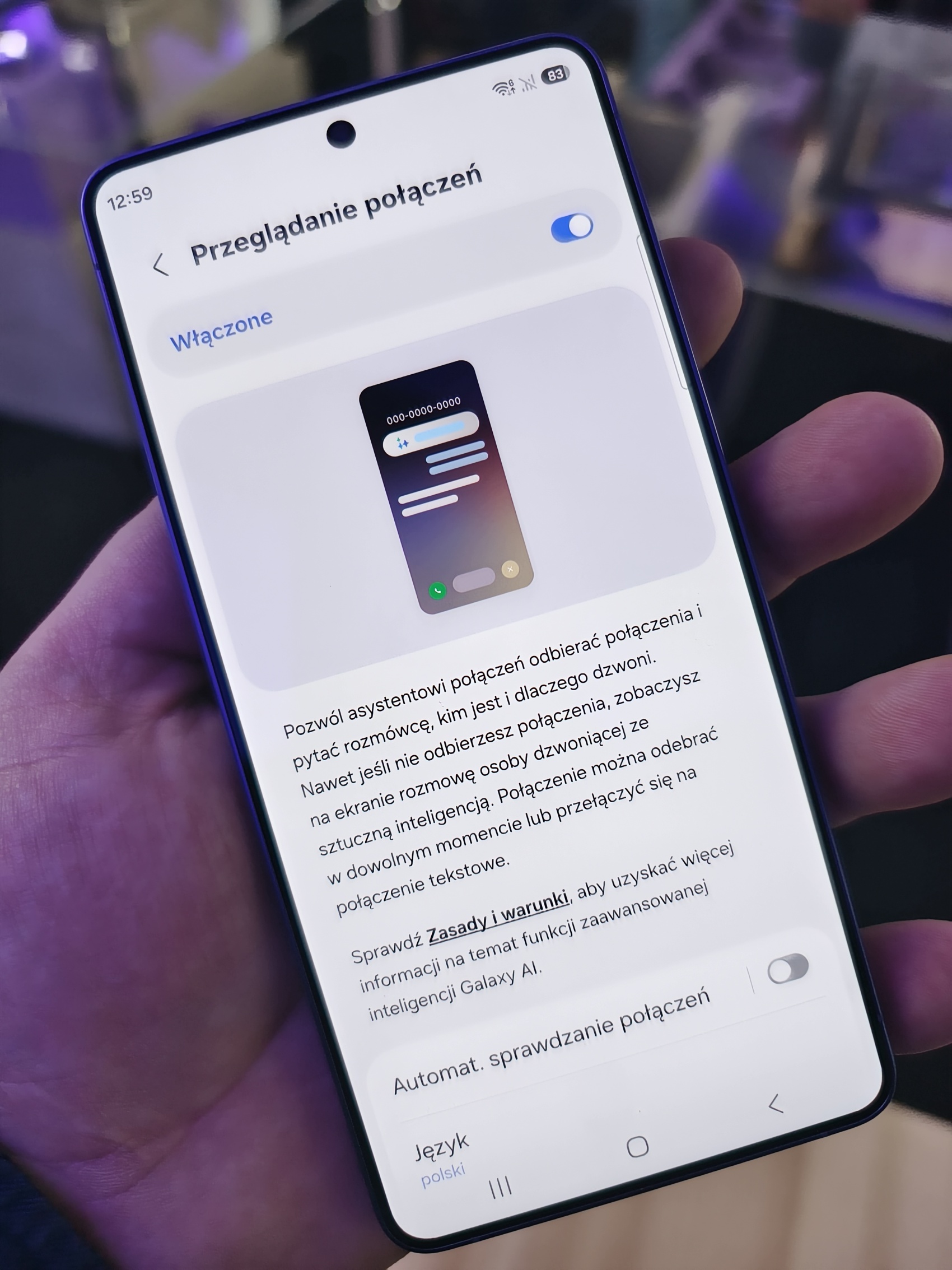 Oczywiście koreański producent zgodnie z panującą modą odmienia AI przez wszystkie przypadki. Najciekawszym zastosowaniem sztucznej inteligencji w nowych urządzeniach będzie chyba lokalna automatyczna sekretarka, która – w zależności od naszego wyboru – może odbierać połączenia oznaczone jako spam lub wszystkie przychodzące z numerów niezapisanych w naszej książce, a następnie pytać dzwoniącego o imię i cel rozmowy. Tę możemy w każdej chwili odebrać sami lub poczekać na zakończenie, a potem przejrzeć podsumowanie. Mamy tu dostęp do zapisu rozmowy w formie tekstowej, audio, a także jej stworzonego przez software streszczenia. Na ten moment wygląda na to, że brak tu jakichś szerszych opcji konfiguracji – no ale zobaczymy, w którą stronę pójdzie to w przyszłości, potencjalnie pomysł jest ciekawy. Język polski doczekał się, rzecz jasna, oficjalnego wsparcia.