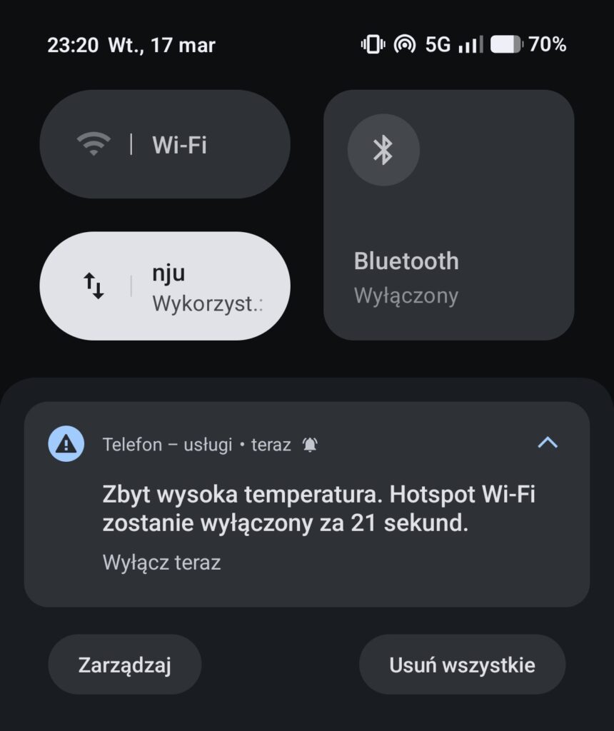 Udostępnianie Wi-Fi z Nothing Phone’a (4a) innym urządzeniom okazało się bardzo nierówne – raz wszystko działało dobrze, a potem z niewiadomych przyczyn „rozsiewanie sieci” samo się wyłączało. Sprawdziłem wszystkie możliwe ustawienia związane z tą funkcją, czyli przede wszystkim oszczędzania baterii, ale też inne. Nic to nie dało – Nothing Phone (4a) czasem wyłączał hotspot po godzinie, innym razem utrzymywał go w aktywności przez całą noc. Na dodatek w trybie 5 GHz zdarzyło mi się przegrzać kilka razy telefon, przez co hotspot także się wyłączał w celu ochrony baterii. Nie działo się to natomiast w trybie 2,4 GHz, ale w nim prędkości były jednak dużo niższe. Czy Nothing naprawi to w przyszłych aktualizacjach? Mam taką nadzieję, bo ostatnie cztery łatki nic tutaj nie zmieniły.