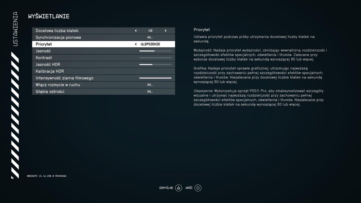 Priorytet ulepszenia to opcja dostępna wyłącznie na PS5 Pro. Podnosi detale jeszcze wyżej niż tryb grafiki, utrzymując wysoką rozdzielczość (4K uzyskiwane z 1440p dzięki PSSR). Można go traktować jako odpowiednik ustawień „ultra” z pecetów, choć z nieco niższym zasięgiem rysowania. W tym trybie gra rzadko osiąga 60 fps-ów – najczęściej działa w przedziale 40–50 klatek na sekundę, ze spadkami w okolice 30 podczas najbardziej intensywnych scen.