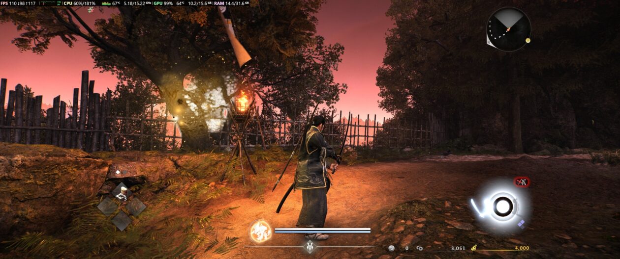 Po przyzwoitych wrażeniach z grania na pececie z dość dużym optymizmem podszedłem do testów na handheldzie. Niestety na moim ROG Xbox Ally X Nioh 3 radził sobie znacznie gorzej. Aby uzyskać stabilne 30 klatek na sekundę w 1080p, musiałem ustawić najniższe detale i włączyć FSR w trybie zbalansowanym, czyli w okolicach 55%.