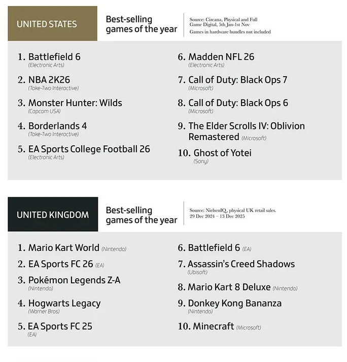 Miny nieco nam jednak zrzedną, gdy spojrzymy na sprzedażowe „topki” w USA i Wielkiej Brytanii. Obie listy bestsellerów okupują wyłącznie sequele popularnych serii strzelanek (Battlefield 6), gier akcji (Ghost of Yōtei) i sportówek (EA Sports FC 26); ewentualnie nowe edycje tytułów już uznanych (Mario Kart 8 Deluxe) lub produkcje tyleż udane, co leciwe (vide 16-letni Minecraft).