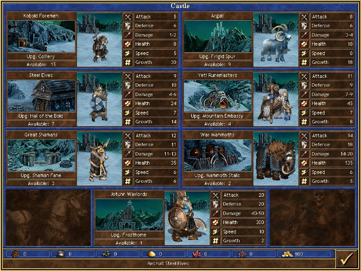 3. Śnieżne Elfy: Jeden z filarów siły miasta. Śnieżne Elfy oferują bardzo solidne statystyki, brak kar w walce wręcz oraz wysoką żywotność. Ich jedynym wyraźnym minusem jest niski zapas strzał – wersja bazowa posiada zaledwie 4, a po ulepszeniu liczba ta wzrasta do 8. Sprawę załatwiłby Wóz z amunicją, tyle że jego niestety nie dostaniemy w kuźni Bulwarku – ten budynek oferuje Namiot medyka.