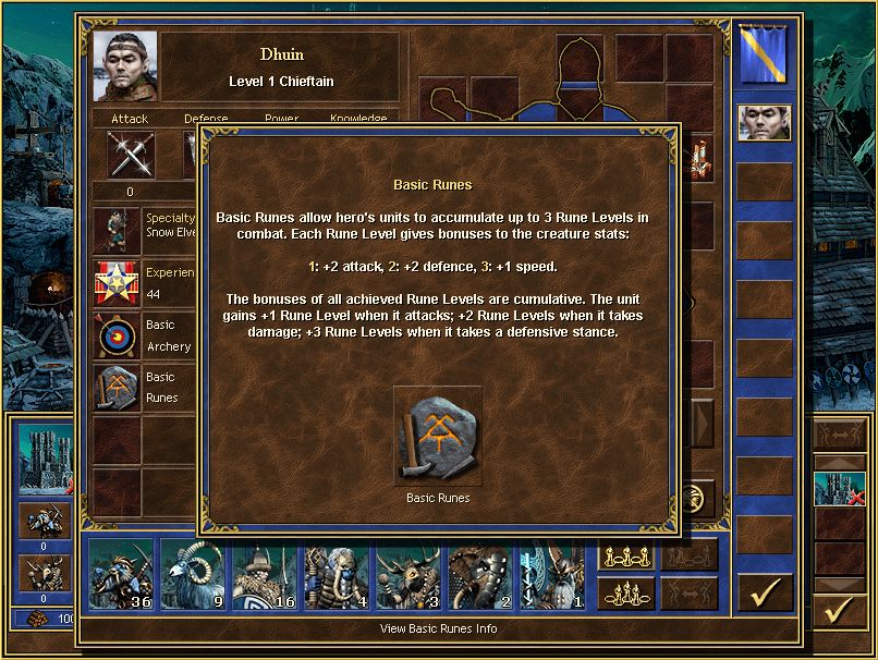 Na poziomie podstawowym (Basic Runes) jednostki bohatera mogą gromadzić do 3 poziomów Run w trakcie jednej bitwy. Każdy zdobyty poziom zapewnia stałe bonusy do statystyk oddziału: