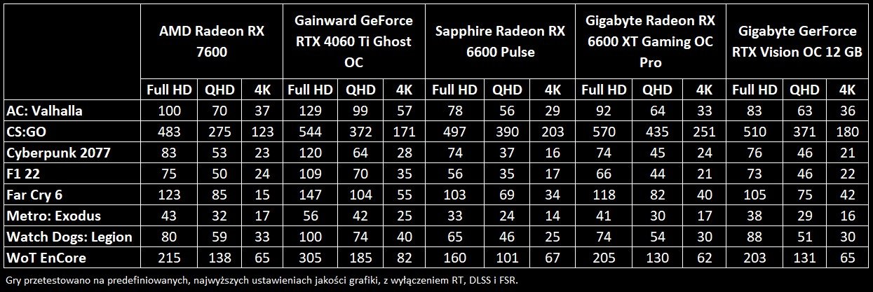 To karta do Full HD – i w zasadzie to zamyka temat. Radeon RX jest urządzeniem, które zapewni wystarczającą wydajność, by cieszyć się rozgrywką w najniższej ze standardowych obecnie rozdzielczości, co oczywiście cieszy. Kolejnym powodem do radości okazuje się fakt, że najnowsza karta AMD kosztuje ok. 1400 zł – dzięki temu znajduje się w zasięgu większości użytkowników szukających gamingowego sprzętu za rozsądną cenę. Takich konstrukcji, a szczególnie już za takie pieniądze, potrzebowaliśmy od dłuższego czasu – to nie ulega najmniejszej wątpliwości. Pod względem możliwości RX 7600 wypada po prostu dobrze, zyskując przewagę ceną lub wydajnością, a niekiedy jednym i drugim.