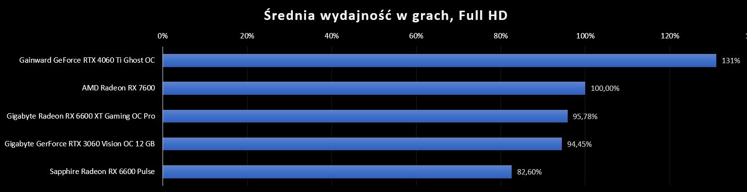 Premiera RX-a 7600 zbiegła się z wypuszczeniem na rynek RTX-a 4060 Ti – co sugerowało, że urządzenia te będą konkurencyjne wobec siebie. Tak się jednak nie stało: jeśli przyjąć, że średnia wydajność testowanego tu sprzętu w Full HD wynosi 100%, to karta Nvidii osiąga na jego tle ok. 131%, jest więc odczuwalnie mocniejsza. Niemniej szybko znalazło to oczywiście odzwierciedlenie w cenie RX-a 7600: początkowo miał kosztować więcej, lecz ostatecznie stanęło na 269 dolarach, co w Polsce powinno przełożyć się na ok. 1400 zł. Do tej kwestii wrócę na końcu.